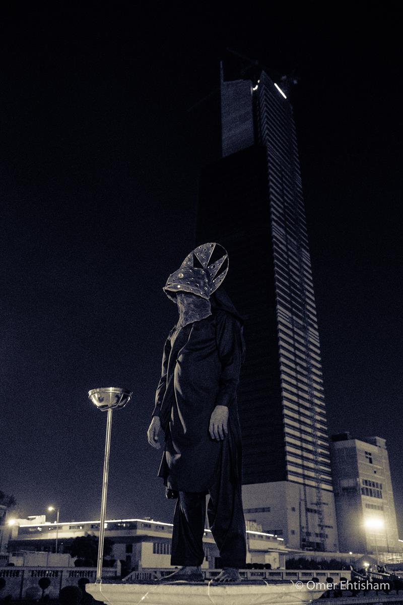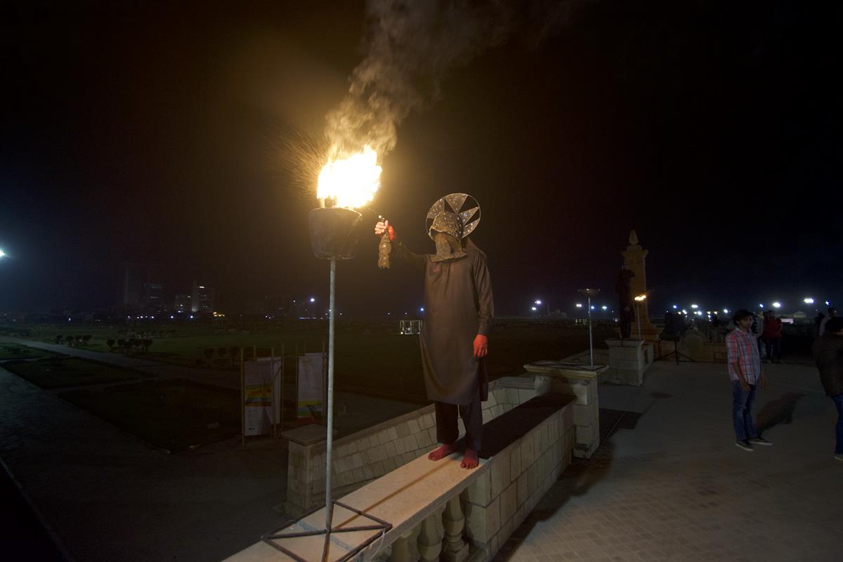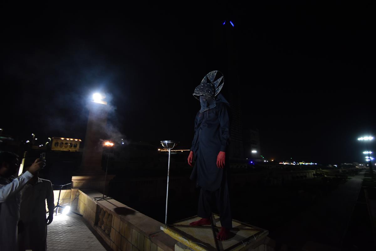 4 Makers involved rituals conceived by Amin to inaugurate his installation, Impossible Growth, for the second iteration of the Karachi Biennale, curated by Muhammed Zeeshan. It was performed by Anthony, Nelson, Raza and Aftab, helpers in his workshop, and was accompanied by a sound piece that they helped create. Amin asked each to make two bird calls each, which, mixed together, were laid over the rhythm of dripping water. Wearing billed masks of nickel-plated copper haloed in mirror, they walked upon the balustrades of Lady Lloyd Pier, a colonial promenade that juts into Bagh Ibne Qasim, a vast park reclaimed from the Arabian Sea. As their collective birdsong played through speakers, they sprayed lit torches with kerosene, causing them to flare. Amin had sourced yellow, green and blue powder used at Holi, a celebration of spring, love and new life, from a nearby Hindu shrine. He gave a dye to each of the quartet, which they rubbed on their hands and feet. The four tossed their assigned colors to the winds, delivering a salaam to the rising skyline around them. At the approach to the performance and the soaring steel, copper and glass installation around which it turned, Amin had also placed an instructional work. Two signs lay upon the ground that read, both in English and Urdu: “If you light an incense stick, tie a strip of cloth, and taste some salt, your wish will come true.” Salt and joss sticks were made available to the audience as were small strips of red cloth and an iron frame upon which to tie them. This invoked the offering of mannat—routinely practiced at Sufi shrines such as that of Abdullah Shah Ghazi, Karachi’s patron saint, less than a mile away—in which devotees make a wish then a vow to God once it has come true.