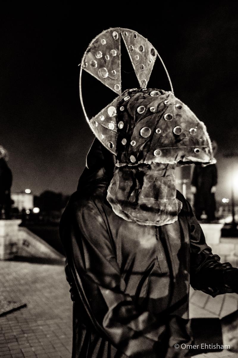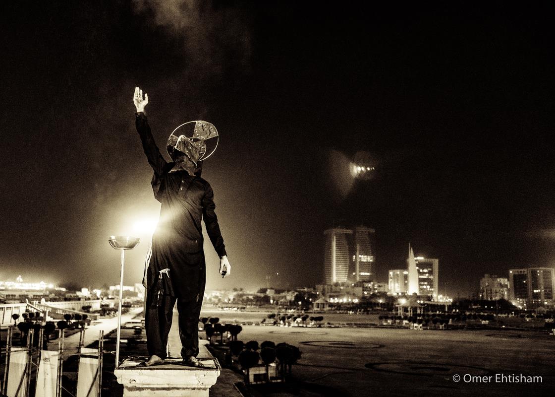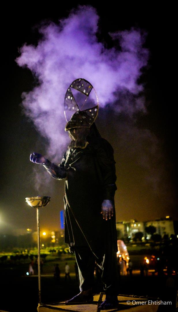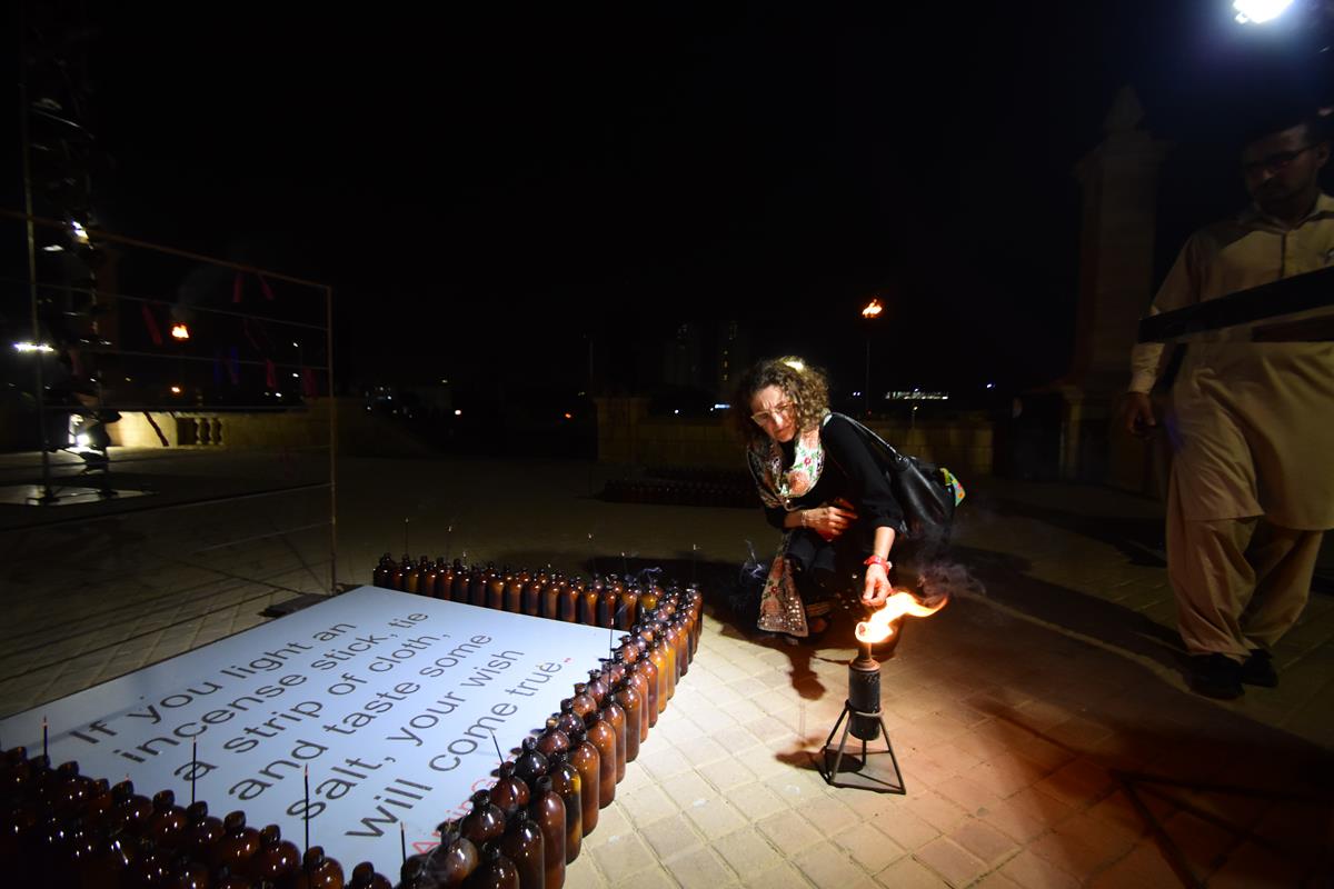 4 Makers involved rituals conceived by Amin to inaugurate his installation, Impossible Growth, for the second iteration of the Karachi Biennale, curated by Muhammed Zeeshan. It was performed by Anthony, Nelson, Raza and Aftab, helpers in his workshop, and was accompanied by a sound piece that they helped create. Amin asked each to make two bird calls each, which, mixed together, were laid over the rhythm of dripping water. Wearing billed masks of nickel-plated copper haloed in mirror, they walked upon the balustrades of Lady Lloyd Pier, a colonial promenade that juts into Bagh Ibne Qasim, a vast park reclaimed from the Arabian Sea. As their collective birdsong played through speakers, they sprayed lit torches with kerosene, causing them to flare. Amin had sourced yellow, green and blue powder used at Holi, a celebration of spring, love and new life, from a nearby Hindu shrine. He gave a dye to each of the quartet, which they rubbed on their hands and feet. The four tossed their assigned colors to the winds, delivering a salaam to the rising skyline around them. At the approach to the performance and the soaring steel, copper and glass installation around which it turned, Amin had also placed an instructional work. Two signs lay upon the ground that read, both in English and Urdu: “If you light an incense stick, tie a strip of cloth, and taste some salt, your wish will come true.” Salt and joss sticks were made available to the audience as were small strips of red cloth and an iron frame upon which to tie them. This invoked the offering of mannat—routinely practiced at Sufi shrines such as that of Abdullah Shah Ghazi, Karachi’s patron saint, less than a mile away—in which devotees make a wish then a vow to God once it has come true.