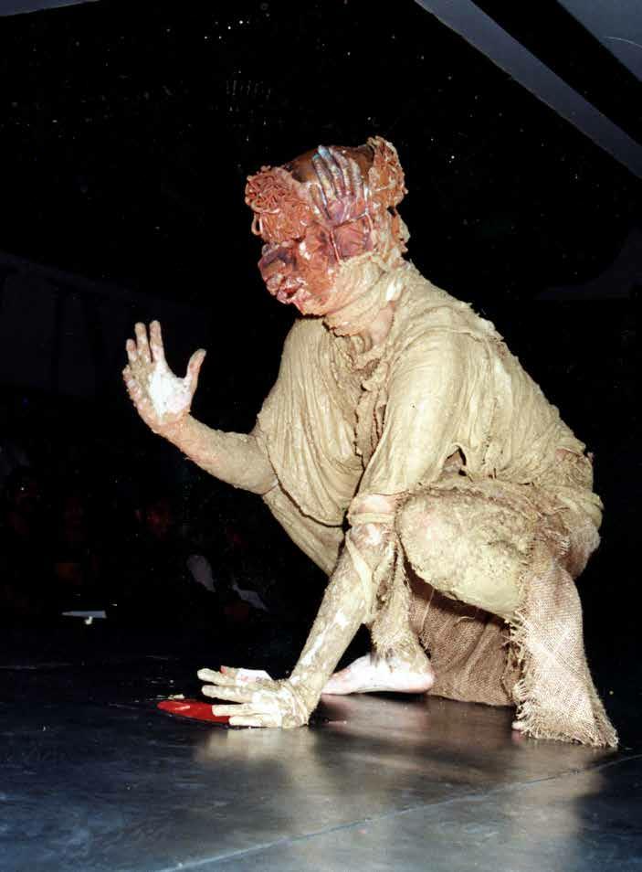 Alchemy was a catwalk-based presentation of Amin Gulgee’s jewelry and sculpture that took place at the former Karachi Sheraton and later at the Moghul-era Lahore Fort. Sonya Battla designed the clothes for the show; Pomme Amina Afzal was its producer; Ustaaz created original music for it. Alchemy was divided into three sections: Bronze, Silver and Gold. Each was introduced by a performance work. In the first, Amin, covered in mud, appeared on the runway with a bronze, Janus-like mask hinged to his head as Shakila Khorasani sang a morning raga offstage. The artist briefly danced, released a powerful scream then ran backstage. In the second section, sculptor Syed Munawar Ali repeatedly fell on his face before somersaulting off the end of the catwalk. In the third, an architecture student strode down the runway with a large gold-plated copper disc strapped to his back, rattling it with outstretched arms. The three main parts of the show were no less performative. In Bronze, female fashion models carried or wore copper sculptural pieces that Amin had created. These objects appeared organic, almost soft. In Silver, the women were dressed in his copper bustiers and other geometric objects plated in nickel, all of which had a cold, linear feel. In Gold, they were adorned with Amin’s gold-plated copper jewelry including his bold, unconventional earrings, pendants and necklaces. Alchemy was ostensibly a fashion show, but was much more than that. His engagement with art jewelry, and the rebellious fashion scene of the time, took advantage of the heady atmosphere of the 1990s when democracy had been restored in Pakistan after a decade of religiously conservative military rule. Creatives in various fields pushed the envelope to test boundaries. Alchemy was not only a testament to Amin’s generation’s aspirations, but sowed the seeds for what would prove to be his deepening engagement with performance art.