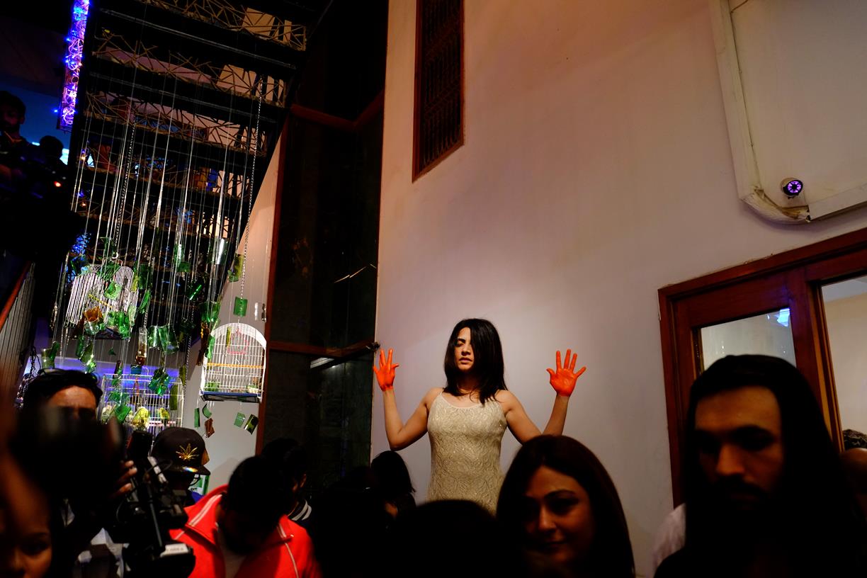Together with Zarmeene Shah, Amin curated Dreamscape in December 2014. Including 48 artists, it was an exhibition of performance unfolding within a series of site-specific installations. As in Riwhyti: One Night Stand, the performances were executed together the night of the opening. In her curatorial essay, Zarmeene referenced a quote by Yoko Ono: “A dream you dream alone is only a dream. A dream you dream together is a reality.” Sunil Shanker and Kashif Hussain, both actors from the National Academy of Performing Arts, climbed ropes suspended from the ceiling, their mouths shut with tape in an apparently Sisyphean struggle against censorship. Omer Wasim stencilled words in chalk in several places on the gallery floor. As was his intention, these fraught, private declarations were destroyed by the shuffling feet of curious viewers who thronged to the gallery to watch the spectacle. Unwittingly, the crowd had completed the work through this “performative” act. In a response to sectarian killings convulsing the region, Muhammad Ali and Manizhe Ali, black tears painted on their cheeks, sat as likenesses of the Mona Lisa in voluminous black skirts before a wall of 1300 red roses knitted by Muhammad Ali over a period of a year. In Things that Happen in Bed # 1, Shalalae Jamil lay on a mattress on a landing of the gallery as a film she shot as a graduate student in Chicago was projected onto the ceiling above her. Positioned next to her was an A4-size piece of paper that proposed: “You are invited to watch a six-minute minute film with the artist in a bed. Please limit your exchange to a greeting and a good-bye.” The work, like the show itself, challenged the relationship between the private and public, the asleep and the awake, the solitary and the collective.