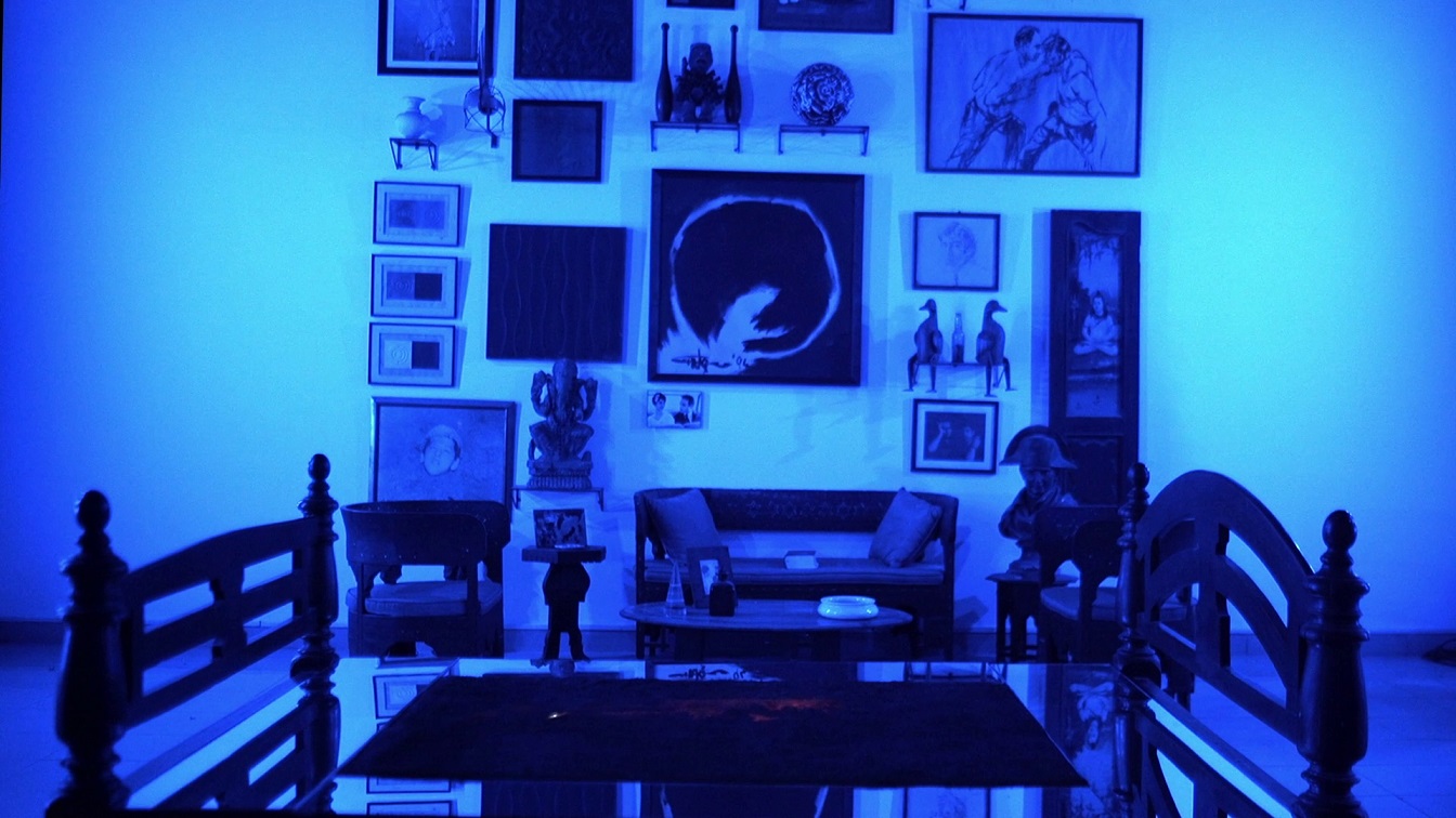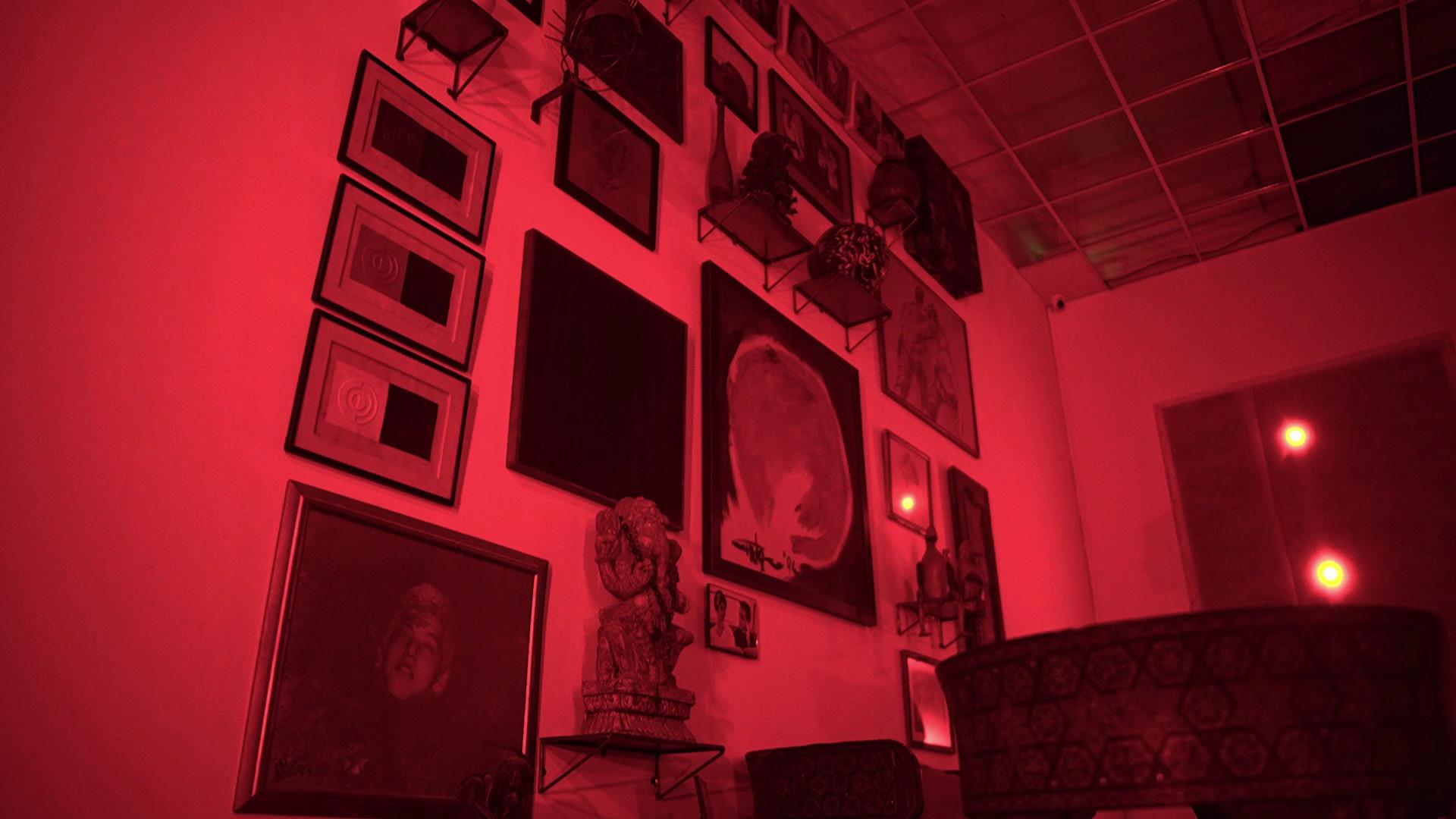 Amin assembled Memory Room 305 for KB22, the third iteration of the Karachi Biennale, curated by Faisal Anwar. This was an immersive installation within a classroom at the Narayan Jagannath Vaidya High School (NJV) in Karachi’s congested downtown. Amin rarely looks back. Yet for KB22 he invited the viewer into the recesses of his own memory through sight, smell, sound and touch. At the center of the room was a colonial-era bed. Amin had removed its mattress and replaced it with mirror. Projected upon it was a looped video of his face covered in turmeric, gasping for air. In an accompanying sound piece, also on loop, he alternately growled, wailed like an infant, or exhaled loudly. On the ceiling above the bed stretched a band of 38 of the artist’s mother’s saris. At one end of the room, steel trays containing turmeric and cayenne pepper jutted from the wall; the smell of the spice in the windowless room stung the nose and eyes. On the opposite wall, Amin had composed a mosaic of objects from his home. It included a black-and-white photograph of his mother and father on their wedding day; a sketch his father made of him as a child. Before it was a Damascene seating arrangement of walnut with mother-of-pearl inlay in Islamic patterns that had always occupied a central place in his parents’ drawing room; next to it was a marble bust of Napoleon that his father had salvaged from a Karachi junkyard. An algorithm randomly selected red, blue and green lights to illuminate the room at intervals of 7, 14 and 27 seconds. The overall effect was disorienting, almost hallucinogenic. The day of KB22’s opening, Moosa Hassan Kamani, a drama teacher at the NJV, performed for over four hours. Covered head to toe in flaking gold leaf, as if in a state of decay, he drifted throughout Memory Room 305, staring at the objects on the wall, or at his own reflection in the mirrored bed. The artist had instructed Moosa to soundlessly approach visitors to the room and gently touch them on the shoulder. He was “my ghost,” said Amin.