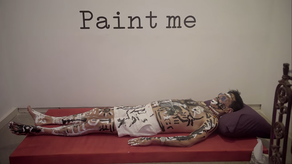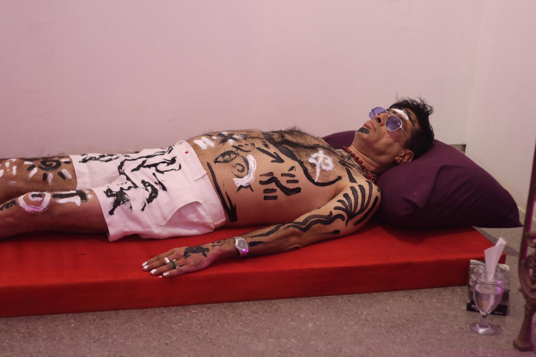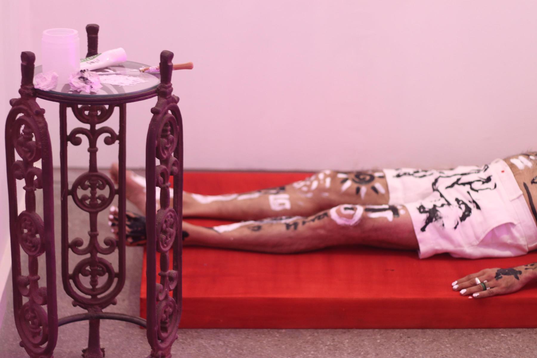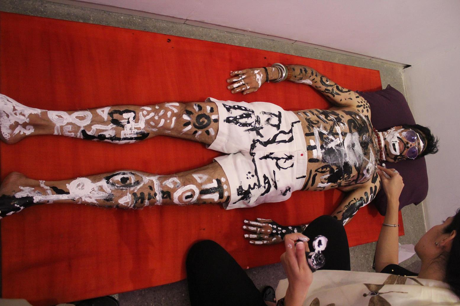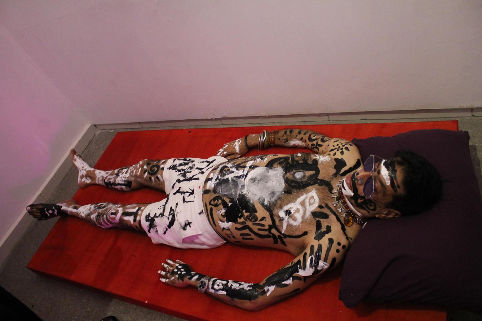 For Mix Tape [1], an exhibition of group performance curated by Sara Pagganwala at Canvas Gallery, Amin lay upon an orange mattress in a pair of white shorts before an instruction stenciled upon the wall: Paint me. A small abstract canvas in an ocean of color painted by his father hung high above his reclining form. On a tall table at his feet were acrylics in black and white as well as a palette knife. Early on in the show, someone hesitantly painted a stick figure upon his bare chest. Taking this as a clue as to how to proceed, others followed suit, some using the knife, others their fingers. By the end of the three-hour show, Amin was covered in paint. This instructional, interactive work was rooted in childhood memory. When Amin was little, his father would invite him into his studio, set up an easel next to his and permit him to use any of his oils. They would then show one another their finished canvases. Although his father never actively encouraged Amin to be an artist, this was their way of bonding. Through Play Me, Amin’s private and public worlds intersected. Lying prone and vulnerable, Amin, his eyes masked by purple-lensed aviator glasses and his head propped upon a violet pillow, quietly revisited his own tender moments of childhood as the public marked him in any way they chose.