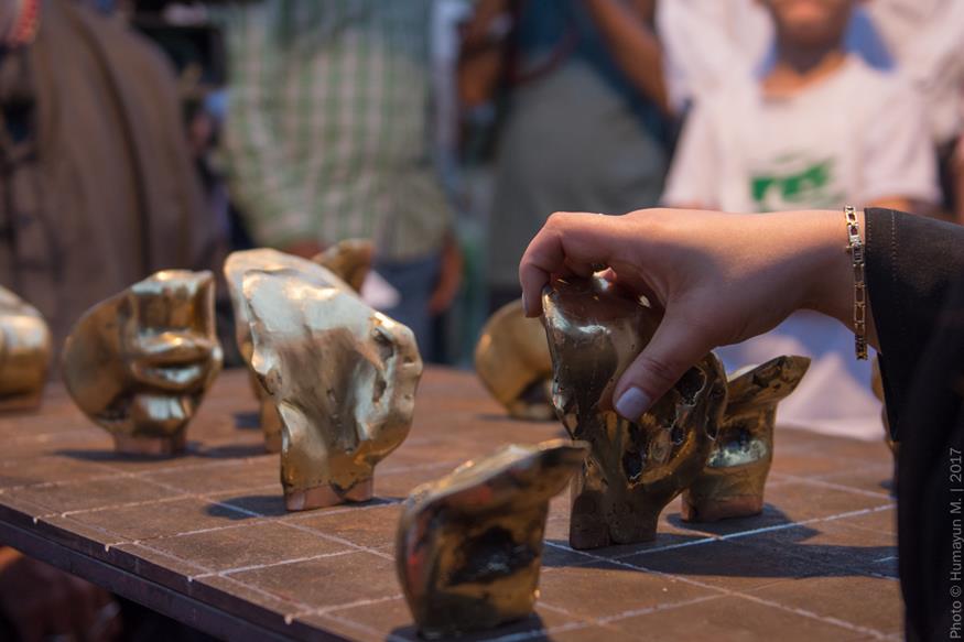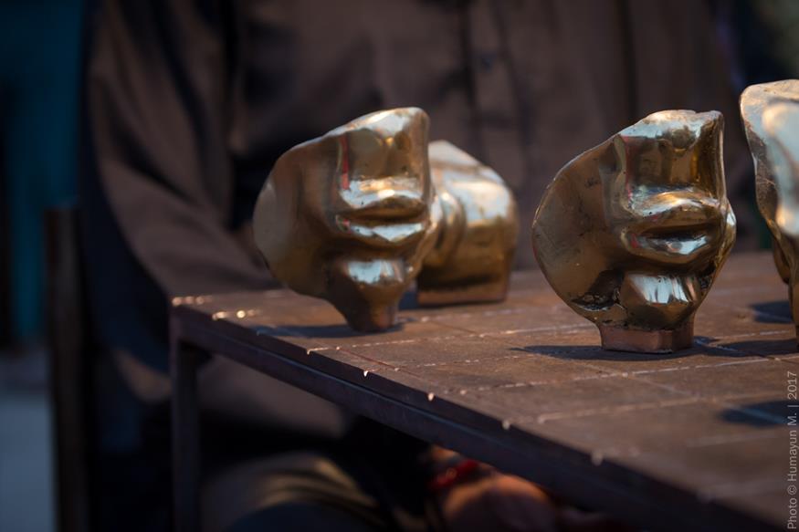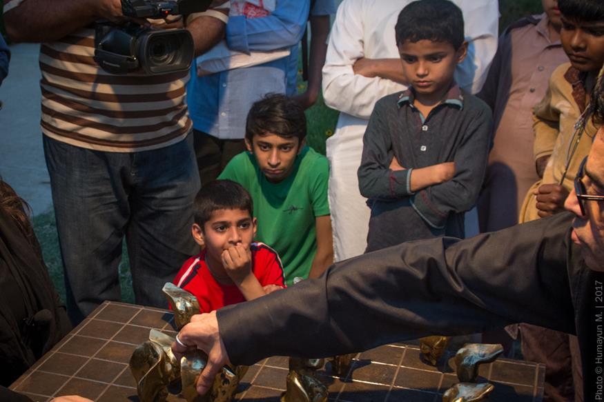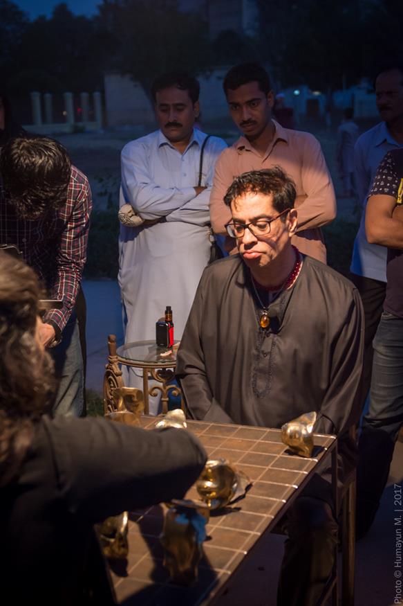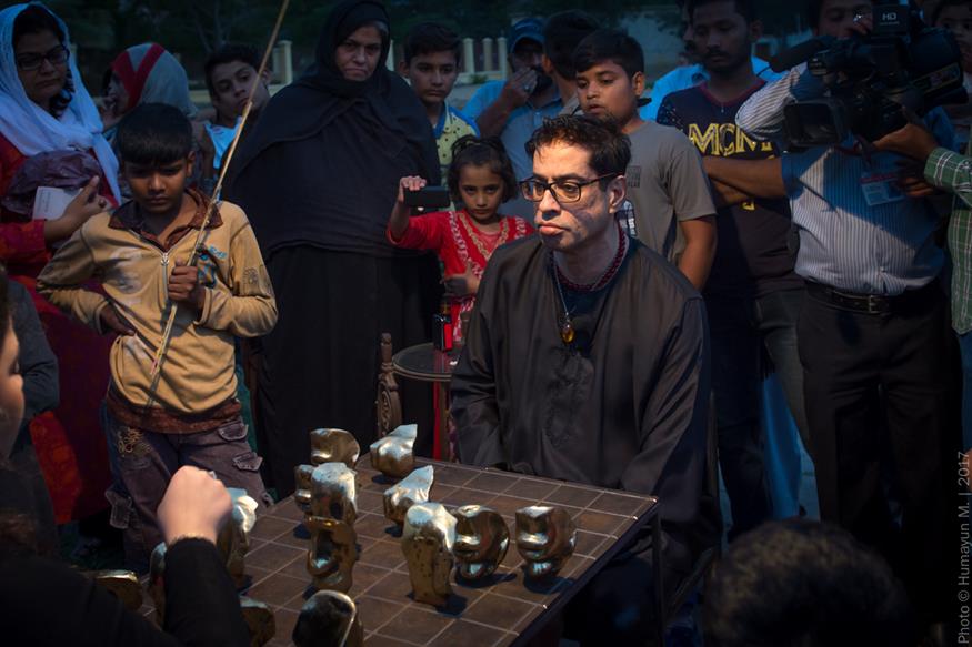 Amin cast parts of his own face in bronze for his performance Play Me, which took place at dusk on the grounds of the National Museum in Karachi. Sitting on steel and copper chairs on either end of a steel table with a brass grid on top, all created by Amin, he and Sara Pagganwala faced off in a game whose rules they made up as they went along. Staring obstinately into one another’s eyes, they slammed duplicates of Amin’s cut-up features upon the board, shouting, “No!” as they aggressively advanced their own set. The antagonism between the two seemed only to build. Children who had gathered in the park to play soon huddled, fascinated by Amin and Sara’s loud sparring. Some, gripping soccer balls, looked on in apparent disbelief as the weighty pieces flew from the table, thudding to the ground. After more than an hour, Sara and Amin rose, gravely shook hands then departed. The work brought to mind Reunion, a 1968 performance by Marcel Duchamp, his wife and John Cage. (Playing on an electronic chessboard, the three created an extemporaneous composition in which each move was reproduced as sound; they continued until the audience got so bored it left.) Amin returned to his performance for Play Me (Duchamp is Dead), in which he and Zarmeene Shah competed over the same chess-like game. The two, laughing maniacally at the absurdity of it all, was included in Outsiders, an exhibition they co-curated with Zeerak Ahmed at the Amin Gulgee Gallery in collaboration with the Goethe-Institut in 2018.