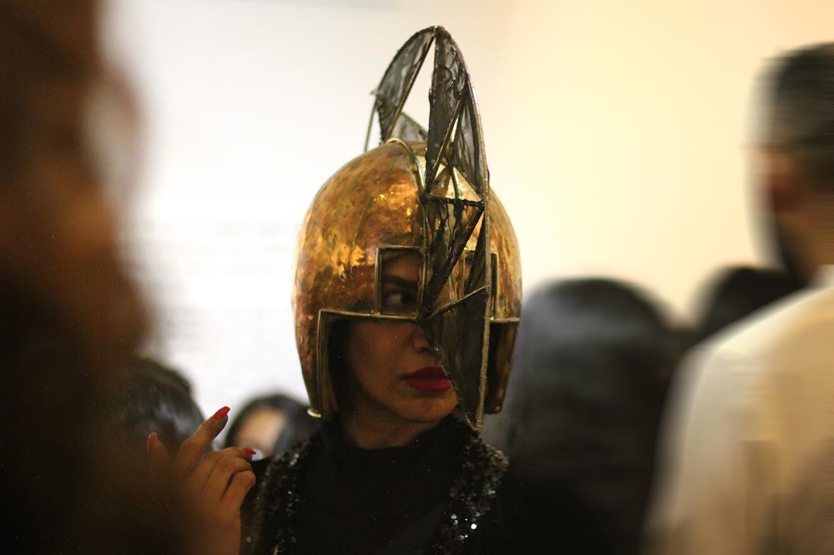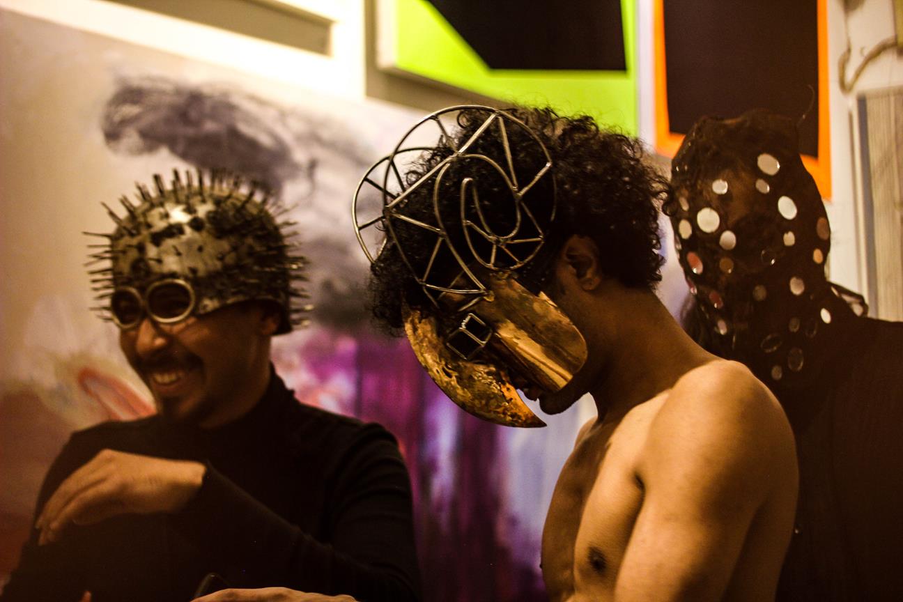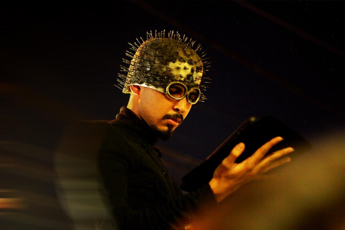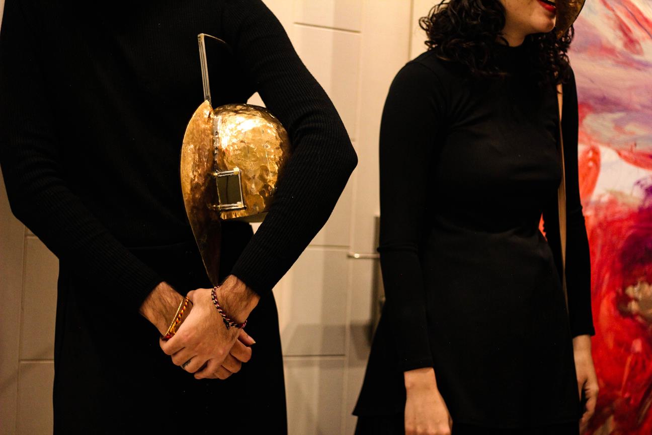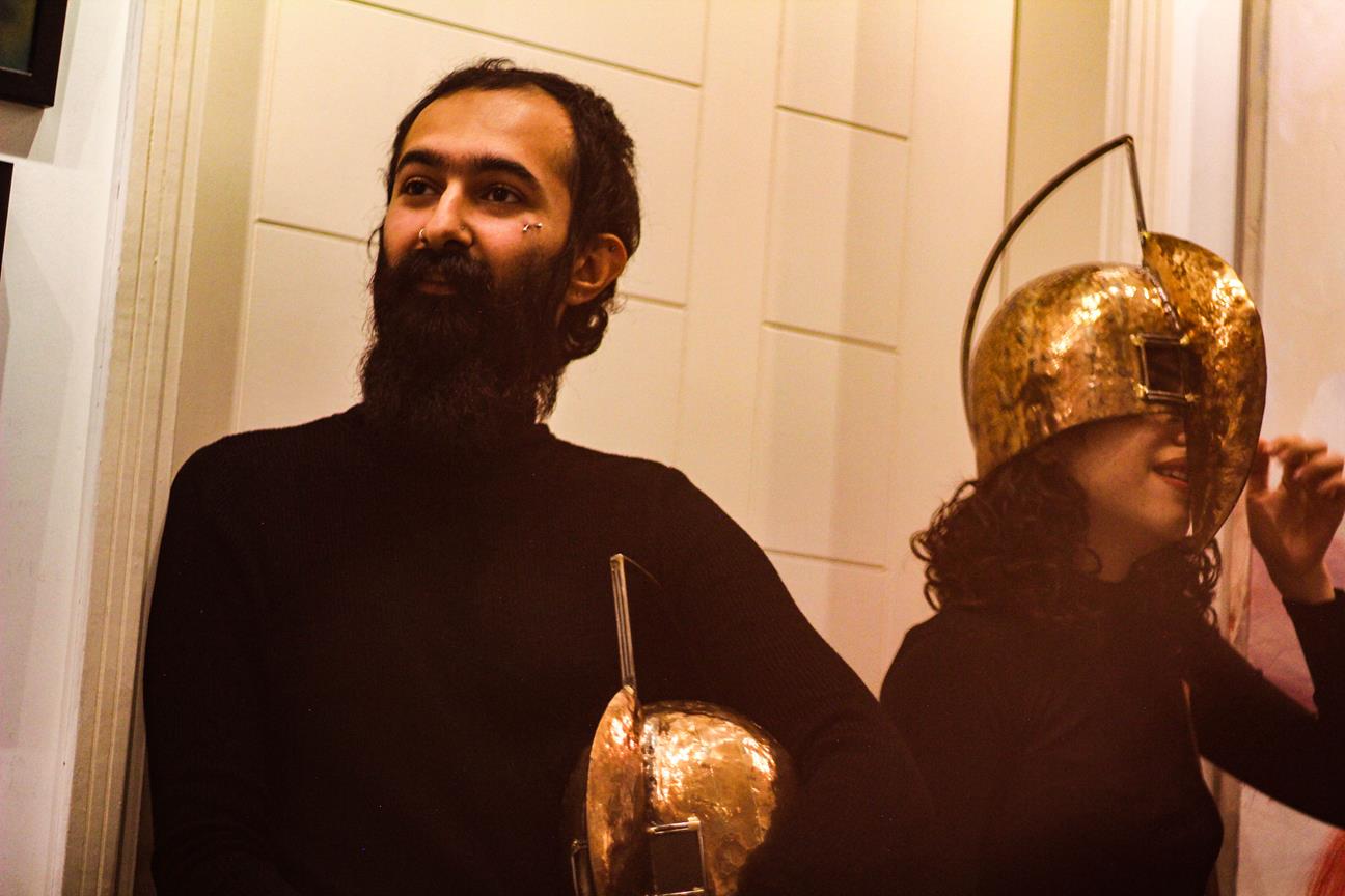 Rather than a curated exhibition of simultaneous performance such as The Q Rickshaw Project or Jagah Hai, Fairytale 72 was what Amin calls “a collaborative performance.” Other examples include This Is Not Your El Dorado in Paris in 2021 and Kiss of the Spider Woman in Chicago in 2022. For these, Amin asks a multidisciplinary group to perform a work that he has conceived, usually, but not always, involving objects that he has made. Sometimes he takes part in these performances; sometimes he doesn’t. Sometimes they occur within a display of his sculptures and installations; other times they don’t. Amin presented Fairytale 72 on the opening of his solo exhibition Spooky Action at a Distance, curated by Adam Fahy-Majeed on February 7, 2023 at Canvas Gallery in Karachi. For this collaborative work, he asked 17 others to enter another dimension with him for about an hour. (Fairytale 72 began at the characteristically imprecise hour of 6:43 pm.) Safeer Jaffrey and Umaina Khan, both wearing masks that they had borrowed from shelves on the gallery’s walls, performed with Amin’s monumental sculpture, The Iron Horn. Sitting on top of it, Umaina, a painter, sang a line from a song in Saraiki that she had written: “Oh, I am looking for you.” Safeer, a musician, moved around the horn, leaning against it, responding with another line from the song: “I am walking in the city alone.” Actor Shaikh Faizan Chawla sat shirtless on a stool in a narrow alcove of the gallery. Wearing a helmet called The Ram, he wrapped his arms around his legs, seeming to retreat into himself. Her face covered in a copper shroud, Maha Minhaj confronted male spectators, shouting at them in Urdu: “Who are you?”; “Where do you come from?”; “What are you doing here?” The alarmed men often tried to explain their presence at the exhibition. In Pakistan, where most public spaces are male-dominated, this was her way of challenging their presence. Through their collaboration, Amin and his fellow performers created a story that had personal resonances for all those involved. Amin likens the process to his object making. His sculptures organically assemble themselves, he states, as do all his collaborative performances.