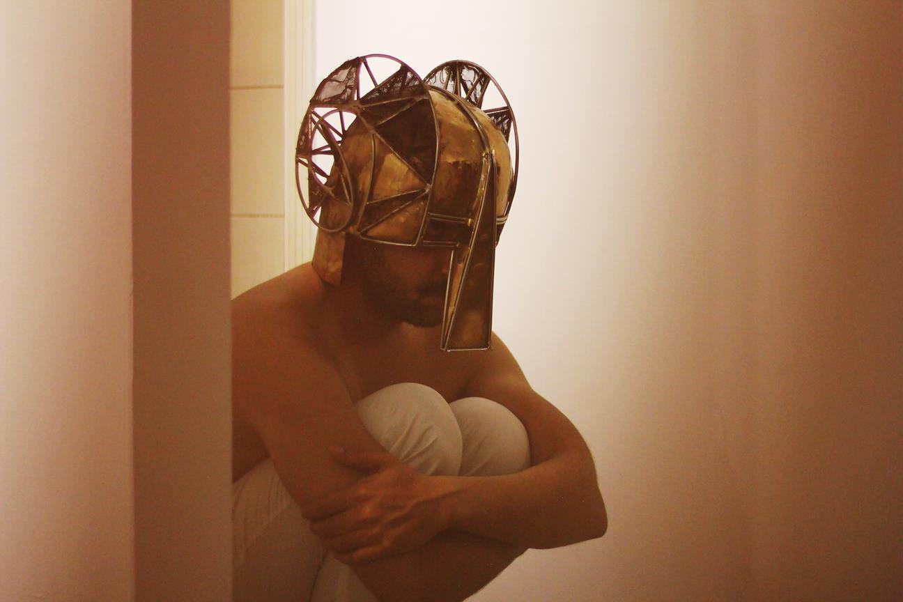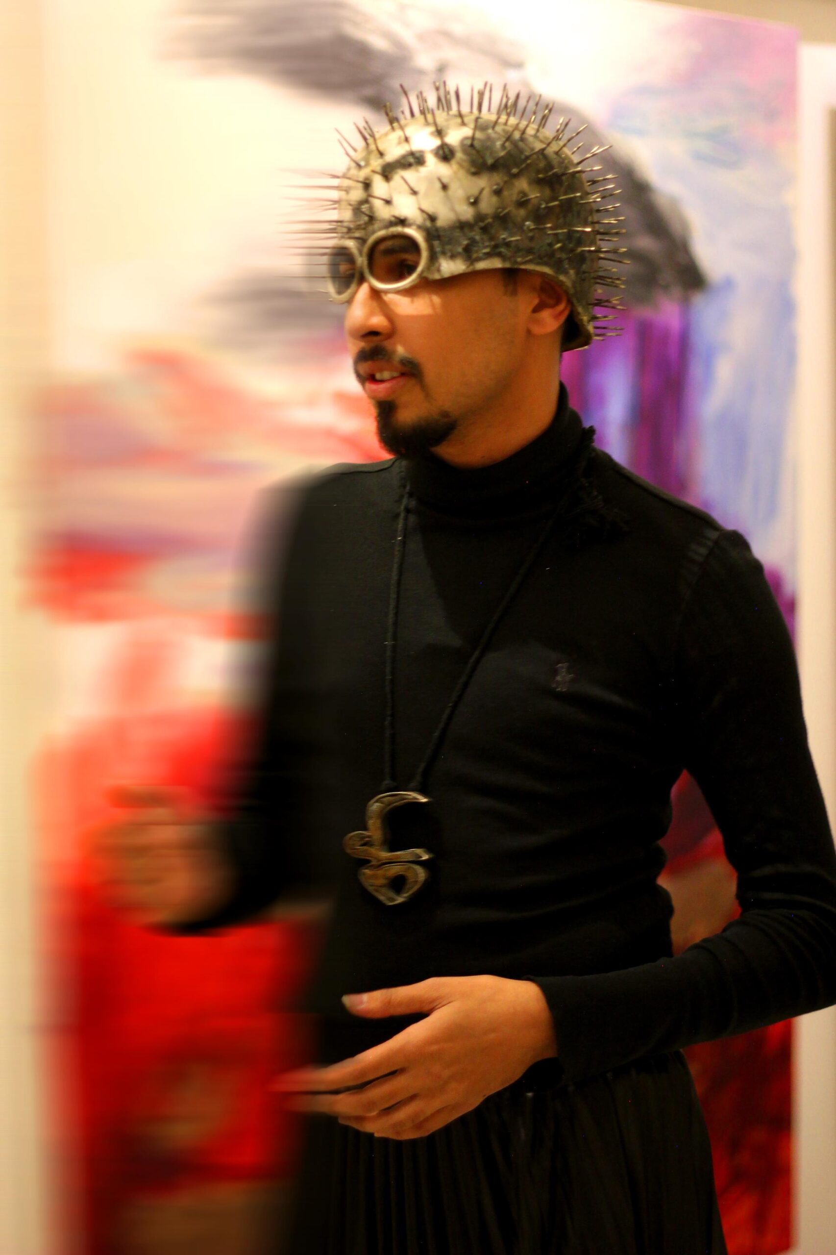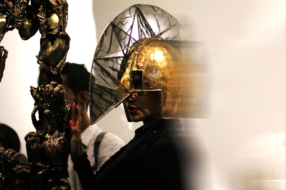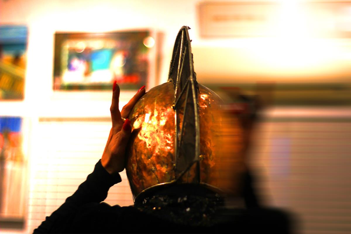 Rather than a curated exhibition of simultaneous performance such as The Q Rickshaw Project or Jagah Hai, Fairytale 72 was what Amin calls “a collaborative performance.” Other examples include This Is Not Your El Dorado in Paris in 2021 and Kiss of the Spider Woman in Chicago in 2022. For these, Amin asks a multidisciplinary group to perform a work that he has conceived, usually, but not always, involving objects that he has made. Sometimes he takes part in these performances; sometimes he doesn’t. Sometimes they occur within a display of his sculptures and installations; other times they don’t. Amin presented Fairytale 72 on the opening of his solo exhibition Spooky Action at a Distance, curated by Adam Fahy-Majeed on February 7, 2023 at Canvas Gallery in Karachi. For this collaborative work, he asked 17 others to enter another dimension with him for about an hour. (Fairytale 72 began at the characteristically imprecise hour of 6:43 pm.) Safeer Jaffrey and Umaina Khan, both wearing masks that they had borrowed from shelves on the gallery’s walls, performed with Amin’s monumental sculpture, The Iron Horn. Sitting on top of it, Umaina, a painter, sang a line from a song in Saraiki that she had written: “Oh, I am looking for you.” Safeer, a musician, moved around the horn, leaning against it, responding with another line from the song: “I am walking in the city alone.” Actor Shaikh Faizan Chawla sat shirtless on a stool in a narrow alcove of the gallery. Wearing a helmet called The Ram, he wrapped his arms around his legs, seeming to retreat into himself. Her face covered in a copper shroud, Maha Minhaj confronted male spectators, shouting at them in Urdu: “Who are you?”; “Where do you come from?”; “What are you doing here?” The alarmed men often tried to explain their presence at the exhibition. In Pakistan, where most public spaces are male-dominated, this was her way of challenging their presence. Through their collaboration, Amin and his fellow performers created a story that had personal resonances for all those involved. Amin likens the process to his object making. His sculptures organically assemble themselves, he states, as do all his collaborative performances.