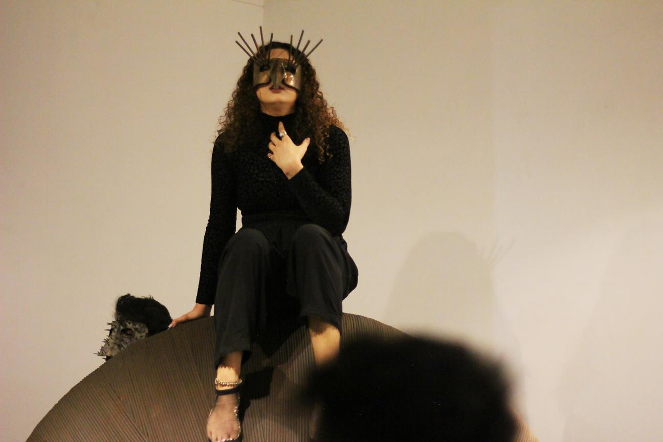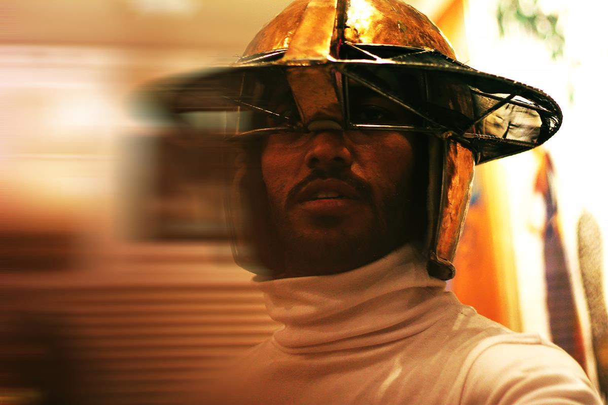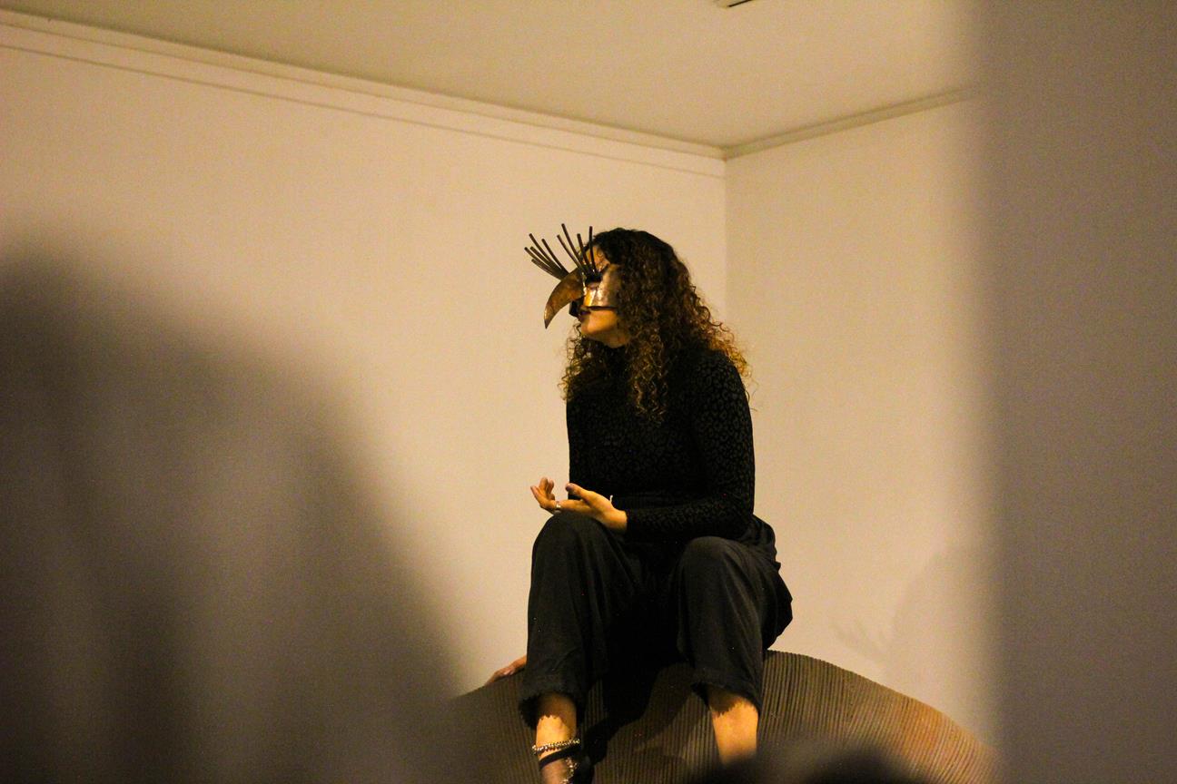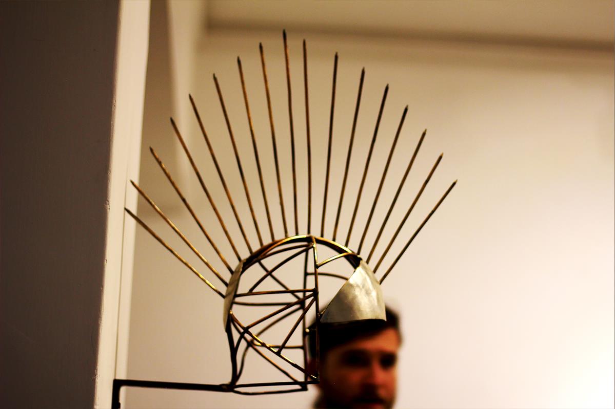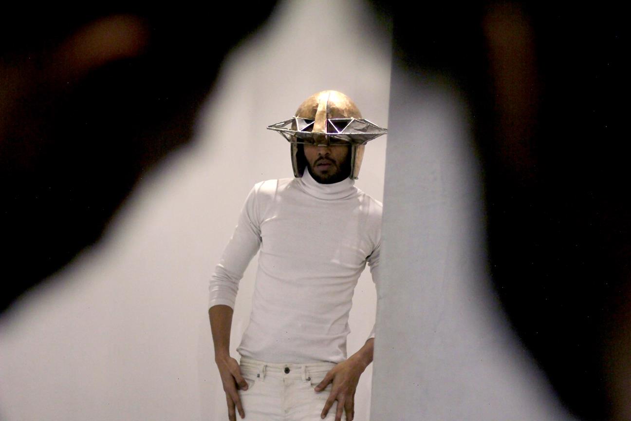 Rather than a curated exhibition of simultaneous performance such as The Q Rickshaw Project or Jagah Hai, Fairytale 72 was what Amin calls “a collaborative performance.” Other examples include This Is Not Your El Dorado in Paris in 2021 and Kiss of the Spider Woman in Chicago in 2022. For these, Amin asks a multidisciplinary group to perform a work that he has conceived, usually, but not always, involving objects that he has made. Sometimes he takes part in these performances; sometimes he doesn’t. Sometimes they occur within a display of his sculptures and installations; other times they don’t. Amin presented Fairytale 72 on the opening of his solo exhibition Spooky Action at a Distance, curated by Adam Fahy-Majeed on February 7, 2023 at Canvas Gallery in Karachi. For this collaborative work, he asked 17 others to enter another dimension with him for about an hour. (Fairytale 72 began at the characteristically imprecise hour of 6:43 pm.) Safeer Jaffrey and Umaina Khan, both wearing masks that they had borrowed from shelves on the gallery’s walls, performed with Amin’s monumental sculpture, The Iron Horn. Sitting on top of it, Umaina, a painter, sang a line from a song in Saraiki that she had written: “Oh, I am looking for you.” Safeer, a musician, moved around the horn, leaning against it, responding with another line from the song: “I am walking in the city alone.” Actor Shaikh Faizan Chawla sat shirtless on a stool in a narrow alcove of the gallery. Wearing a helmet called The Ram, he wrapped his arms around his legs, seeming to retreat into himself. Her face covered in a copper shroud, Maha Minhaj confronted male spectators, shouting at them in Urdu: “Who are you?”; “Where do you come from?”; “What are you doing here?” The alarmed men often tried to explain their presence at the exhibition. In Pakistan, where most public spaces are male-dominated, this was her way of challenging their presence. Through their collaboration, Amin and his fellow performers created a story that had personal resonances for all those involved. Amin likens the process to his object making. His sculptures organically assemble themselves, he states, as do all his collaborative performances.