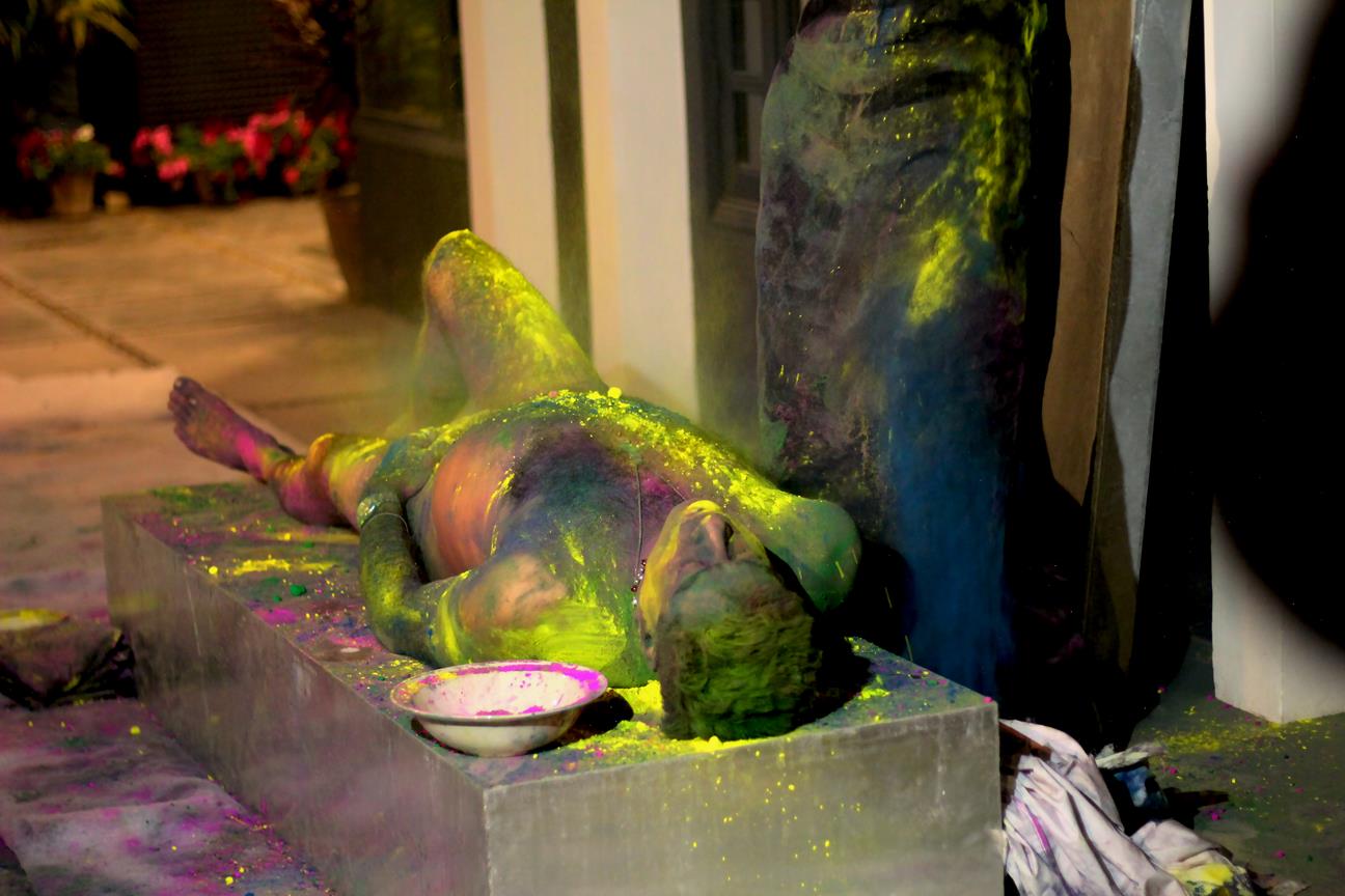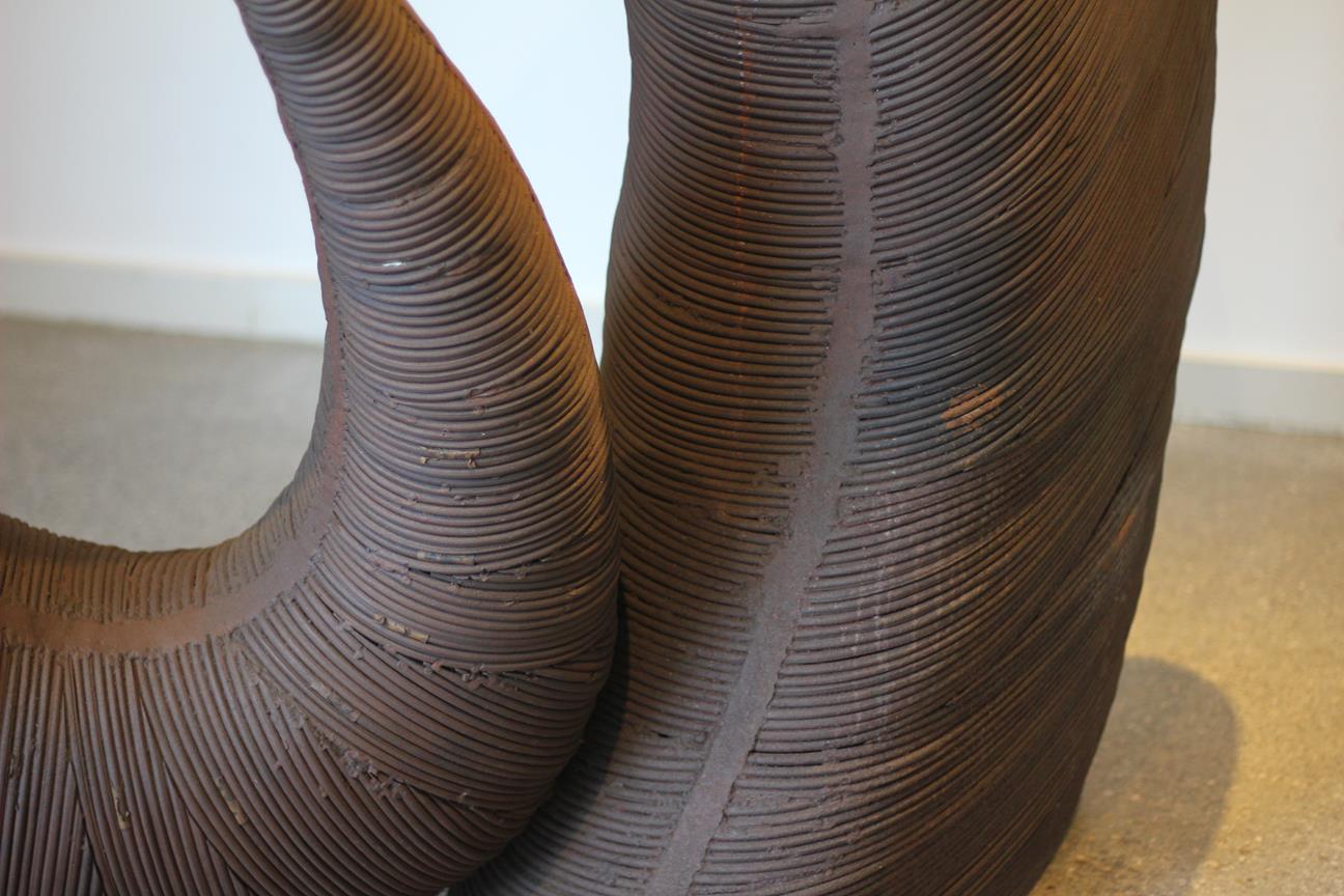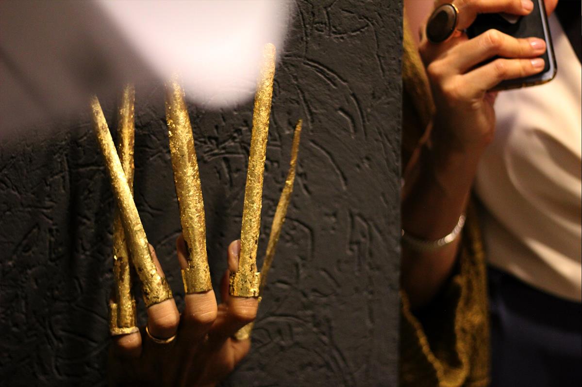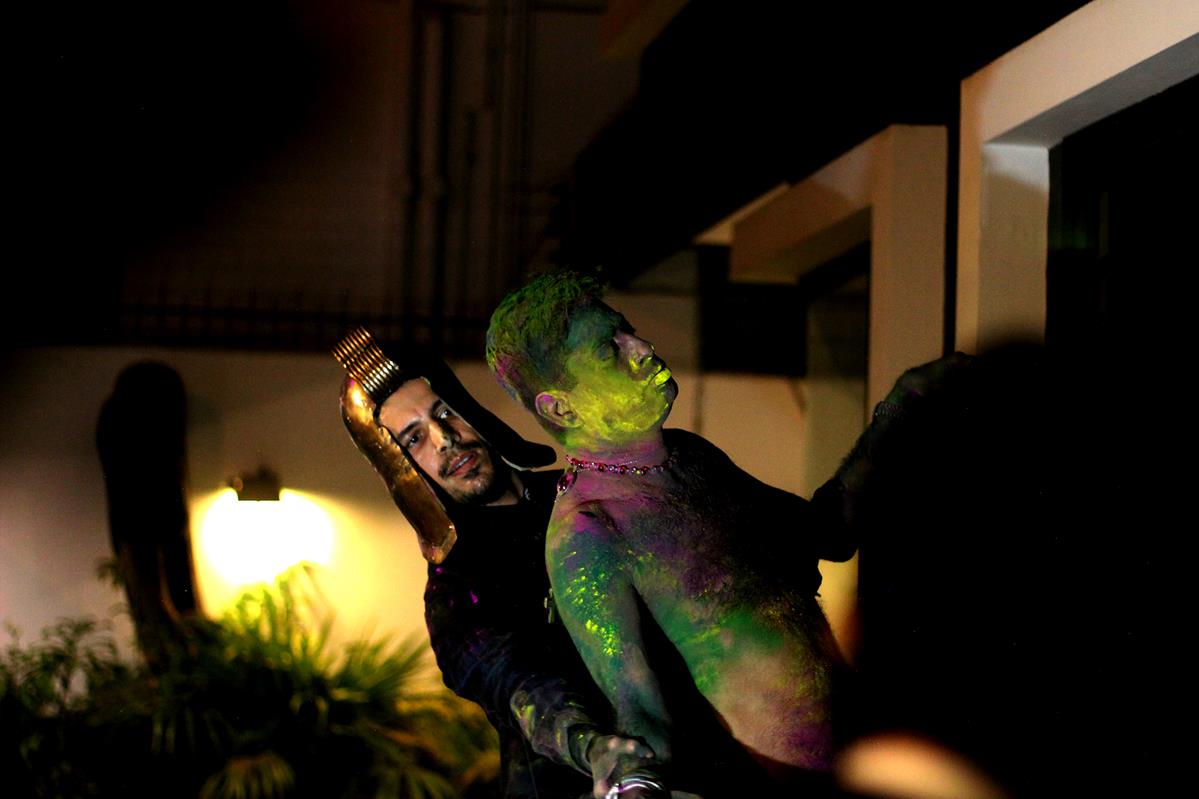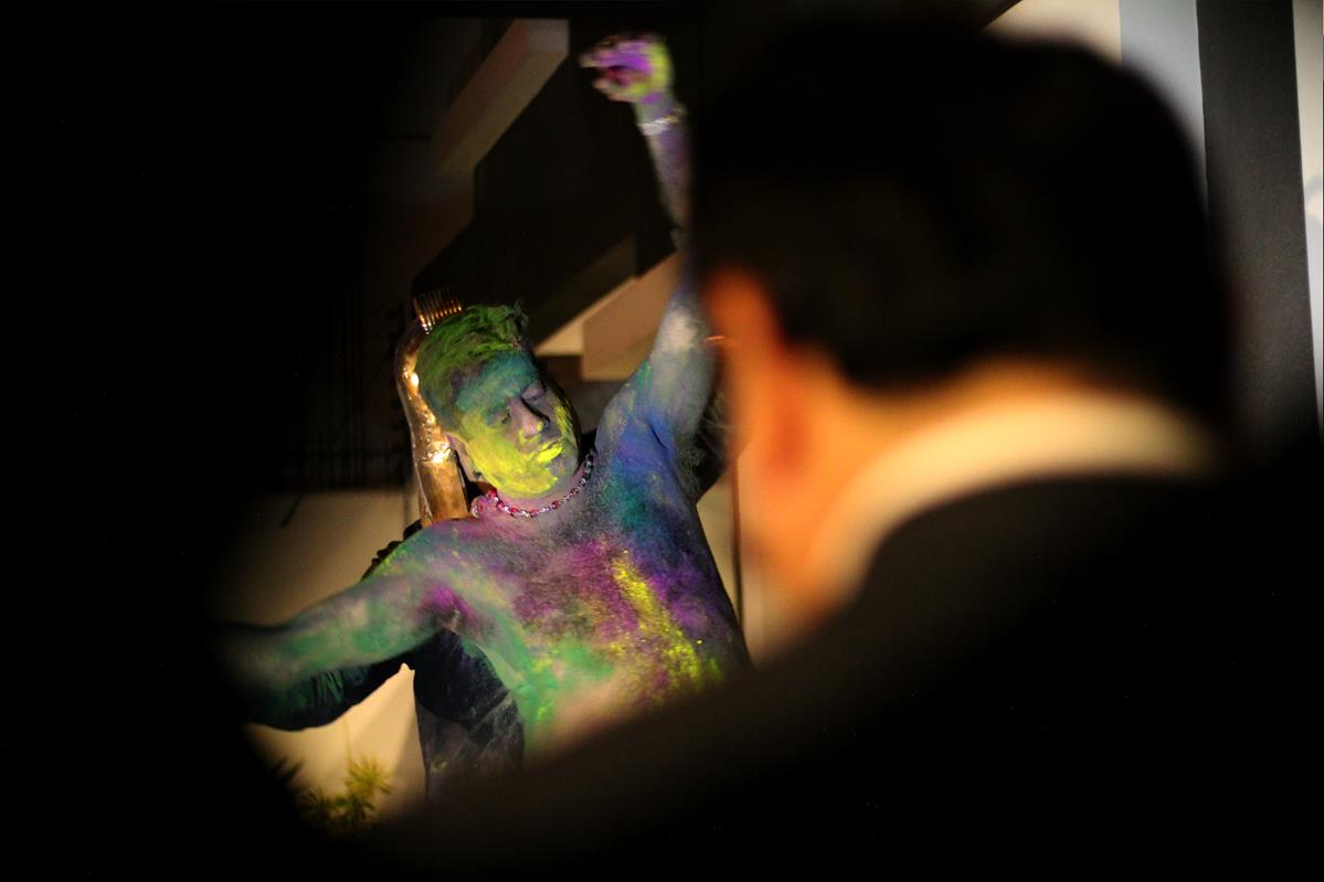 Rather than a curated exhibition of simultaneous performance such as The Q Rickshaw Project or Jagah Hai, Fairytale 72 was what Amin calls “a collaborative performance.” Other examples include This Is Not Your El Dorado in Paris in 2021 and Kiss of the Spider Woman in Chicago in 2022. For these, Amin asks a multidisciplinary group to perform a work that he has conceived, usually, but not always, involving objects that he has made. Sometimes he takes part in these performances; sometimes he doesn’t. Sometimes they occur within a display of his sculptures and installations; other times they don’t. Amin presented Fairytale 72 on the opening of his solo exhibition Spooky Action at a Distance, curated by Adam Fahy-Majeed on February 7, 2023 at Canvas Gallery in Karachi. For this collaborative work, he asked 17 others to enter another dimension with him for about an hour. (Fairytale 72 began at the characteristically imprecise hour of 6:43 pm.) Safeer Jaffrey and Umaina Khan, both wearing masks that they had borrowed from shelves on the gallery’s walls, performed with Amin’s monumental sculpture, The Iron Horn. Sitting on top of it, Umaina, a painter, sang a line from a song in Saraiki that she had written: “Oh, I am looking for you.” Safeer, a musician, moved around the horn, leaning against it, responding with another line from the song: “I am walking in the city alone.” Actor Shaikh Faizan Chawla sat shirtless on a stool in a narrow alcove of the gallery. Wearing a helmet called The Ram, he wrapped his arms around his legs, seeming to retreat into himself. Her face covered in a copper shroud, Maha Minhaj confronted male spectators, shouting at them in Urdu: “Who are you?”; “Where do you come from?”; “What are you doing here?” The alarmed men often tried to explain their presence at the exhibition. In Pakistan, where most public spaces are male-dominated, this was her way of challenging their presence. Through their collaboration, Amin and his fellow performers created a story that had personal resonances for all those involved. Amin likens the process to his object making. His sculptures organically assemble themselves, he states, as do all his collaborative performances.