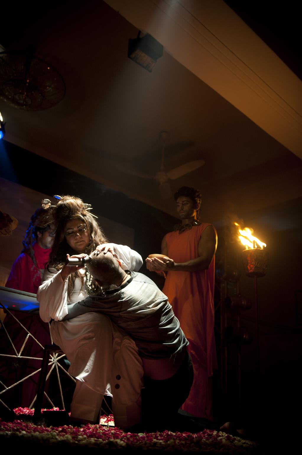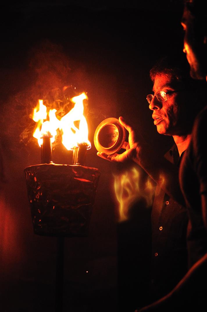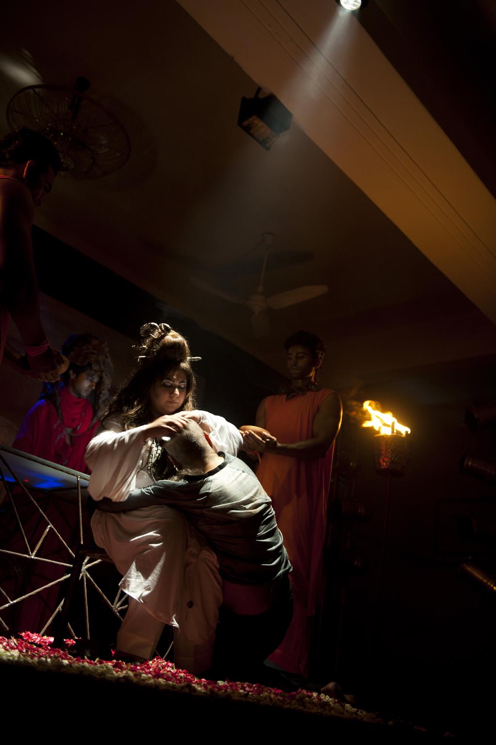 In Islam and in Hinduism, a baby’s head is shaved seven days after its birth to protect it from evil. Referencing this ritual, Amin asked people close to him to help perform a vulnerable performance in which his head was shorn. Amin presented The Healing at the Beach Luxury Hotel in Karachi at an event honoring Ali Imam (1924-2002), a pioneering Karachi gallerist who was both a colleague and friend of Amin’s mother and father. For this, a man carried Amin’s inert body through the audience as another man bearing two lit copper torches followed. Amin wore severe black while the two men attending to him were attired in saffron robes and necklaces of copper set with shards of green glass. The man carrying Amin gingerly laid him in the lap of Rukaiya Adamjee, who, dressed in white, sat alone on a spot-lit chair within a circle of red rose petals. Nearby, a third man, also in saffron robes, and wearing a tall conical headpiece of copper, sat before a computer and performed an electronic composition. Rukaiya, a dear friend of Amin’s whose mother was also a confidant of Amin’s mother, tenderly shaved his head with a buzzing razor, handing his hair to the two men who had ceremoniously brought him forward. They gathered it in earthenware vessels found throughout Pakistan before burning it in the flames of the torches. His head denuded, a bereaved Amin slowly rose and danced before Rukaiya, who opened her arms, seeming to both protect and release him.