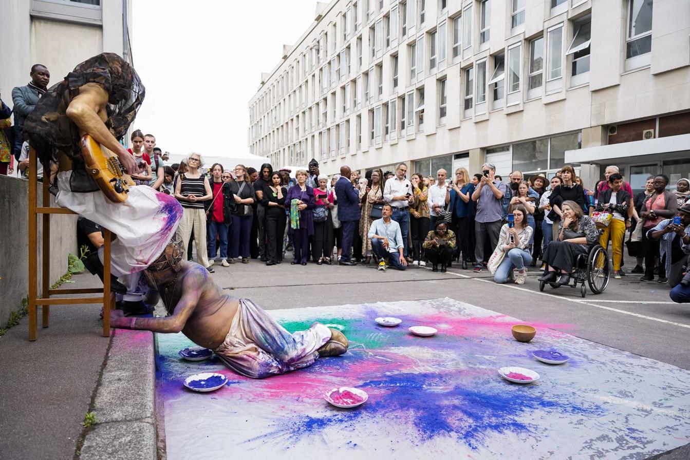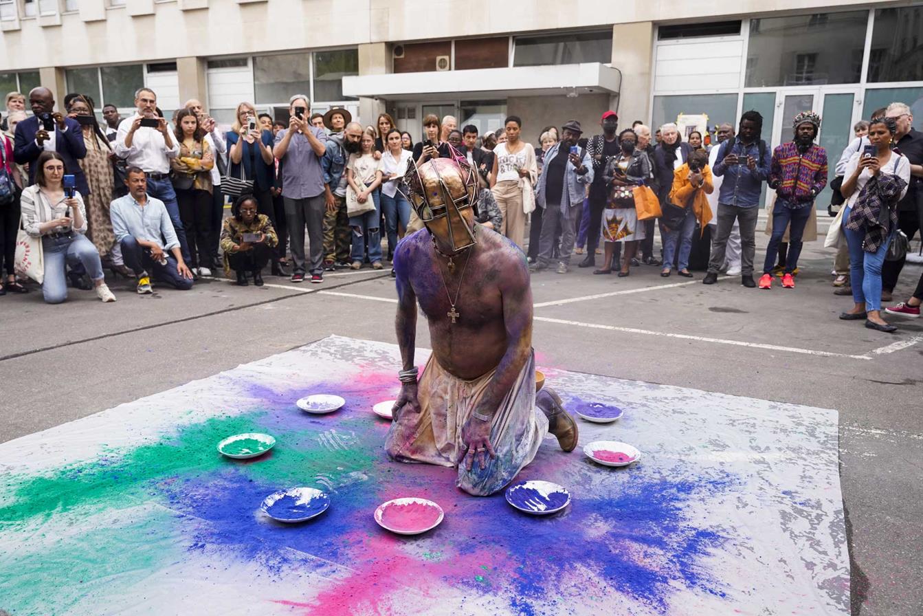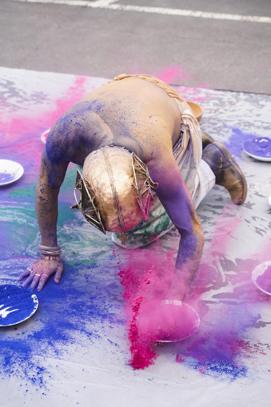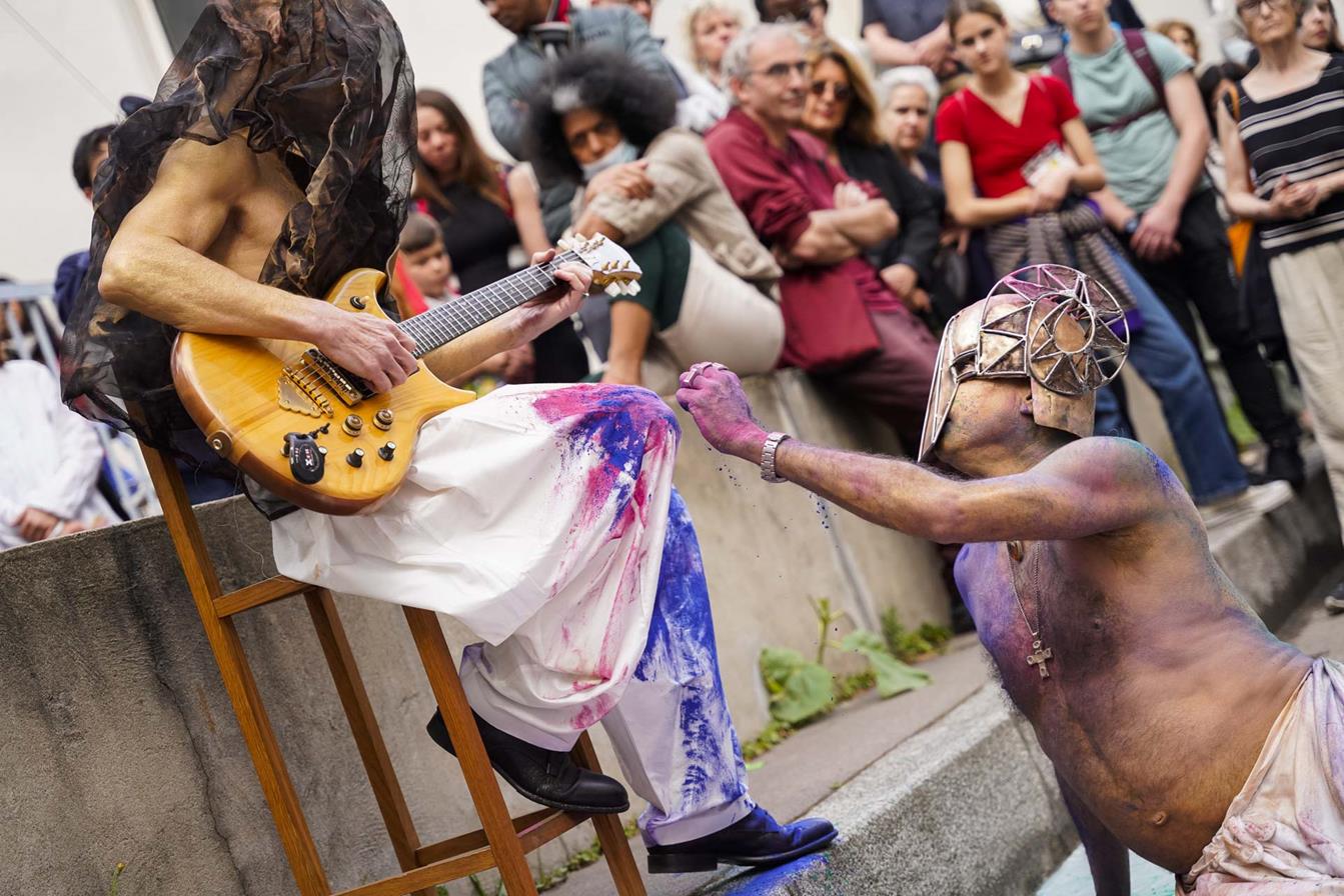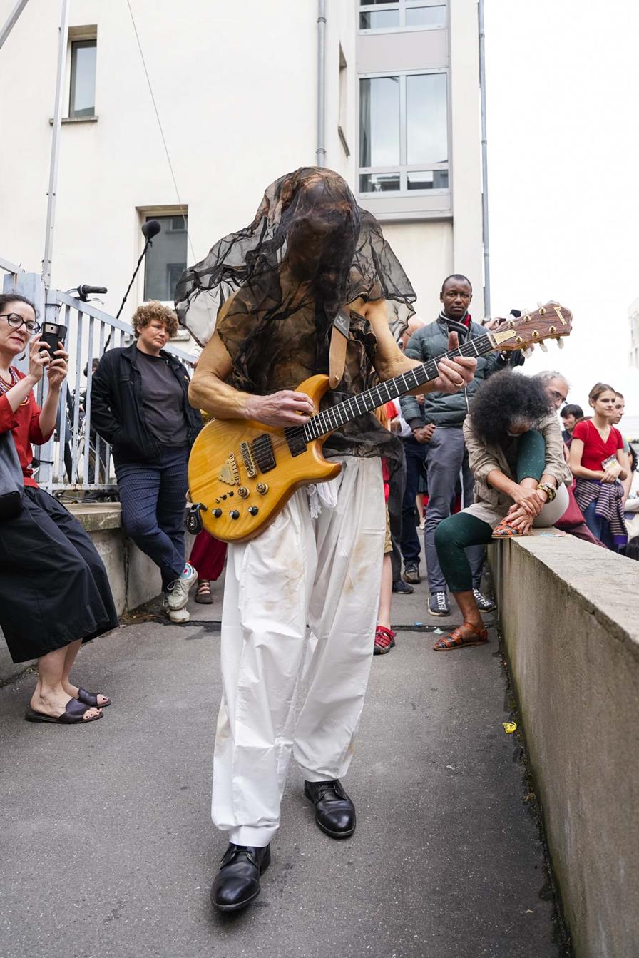 In June 2022, Amin presented Requiem for the inauguration of ENTRELACS/INTERLACED at the Cité international des arts in Paris. This was an exhibition, symposium and series of performances in memory of Dominique Malaquais (1964-2021). An art historian and political scientist, Dominique dedicated her life and work to African worlds. Amin, who had known Dominique since they were freshmen at Yale, performed Requiem with Bart Legum, Dominque’s widower. Bare-chested, both wore white shalwar. Anointed in gold leaf, Bart’s head and shoulders were enveloped in a shroud of copper mesh that Amin had made for him. On Amin’s head was a copper helmet with curved, ram-like horns, rectangular eyes and a long, triangular nose. Like so many of Amin’s worn sculptures, these evoked a mythical era of his own making. (For this performance, they corresponded to his installation Elysian Fields for the accompanying show at the Cité’s gallery, where he reimagined the resting place of the heroic and virtuous in Greek mythology as a bed of coal strewn with fragments of Arabic text.) Hidden on an upper terrace of the Cité’s courtyard, Bart began the performance by producing screeching cords from an electric guitar. Amin frantically pushed himself through the assembled crowd below to a plastic sheet spread on the ground where nine plates holding powder of various colors had been placed in a circle. Crouching at their center, Amin slammed his palms to the ground and mournfully cried “Allah!” three times. He then grabbed handfuls of the pigment and tossed them over himself. Bart slowly descended a brief flight of steps, still playing his guitar, and perched on a high stool. Amin crawled towards him, marking the hem of his shalwar. Bart performed a song in both English and French that he had written, a kind of mantra that he sings to himself whenever Dominque’s absence becomes particularly painful. Solemnly, he sang: “Rest with the angels, my wonderful Do/You are an angel, my wonderful Do/You are my love and my light and my life.”