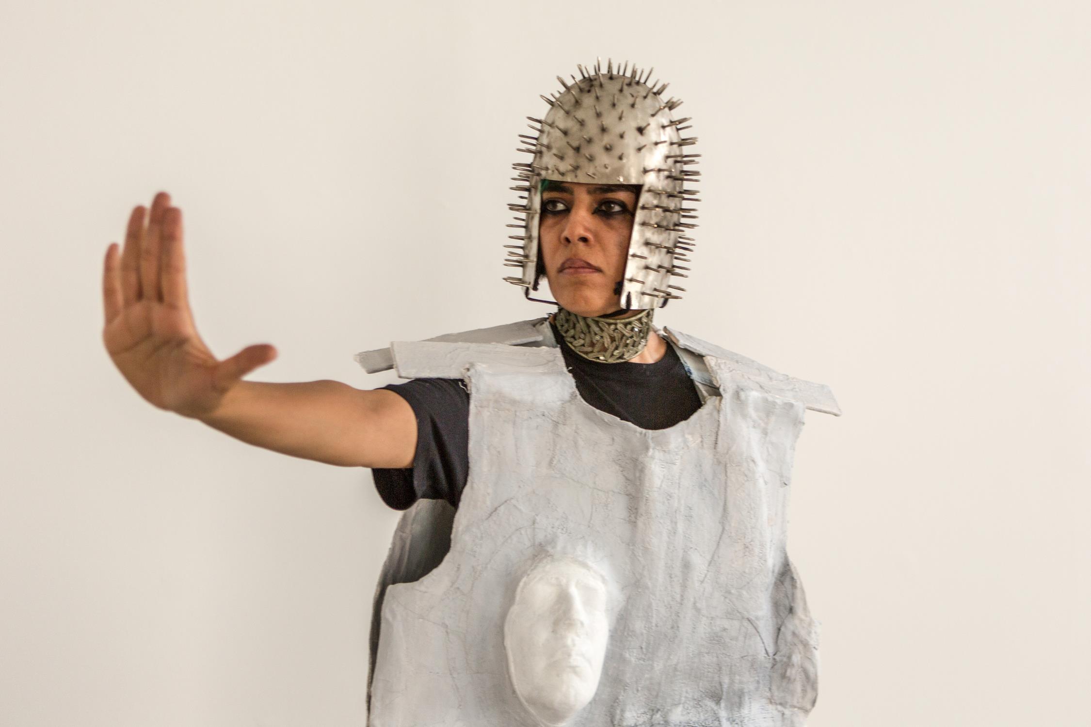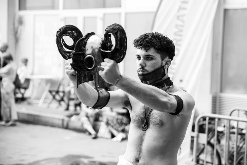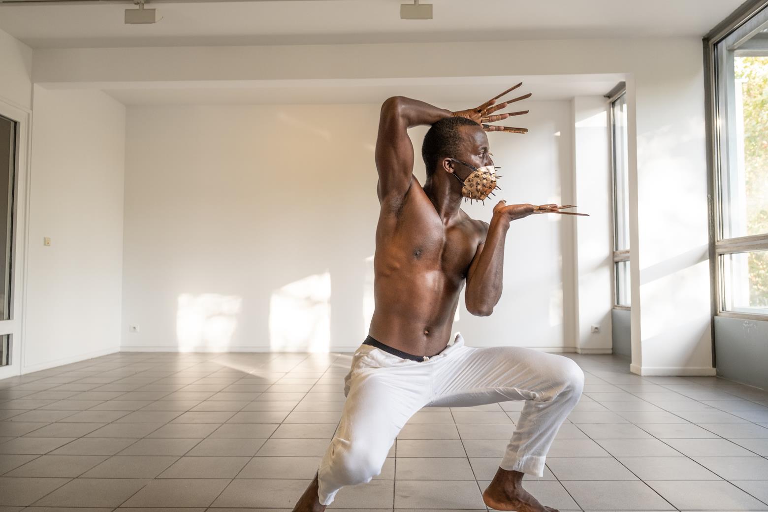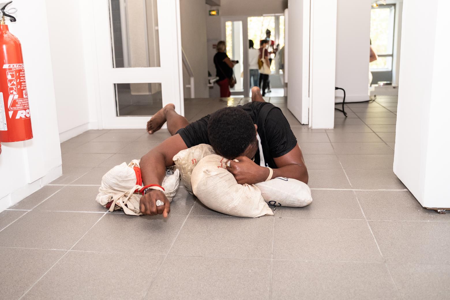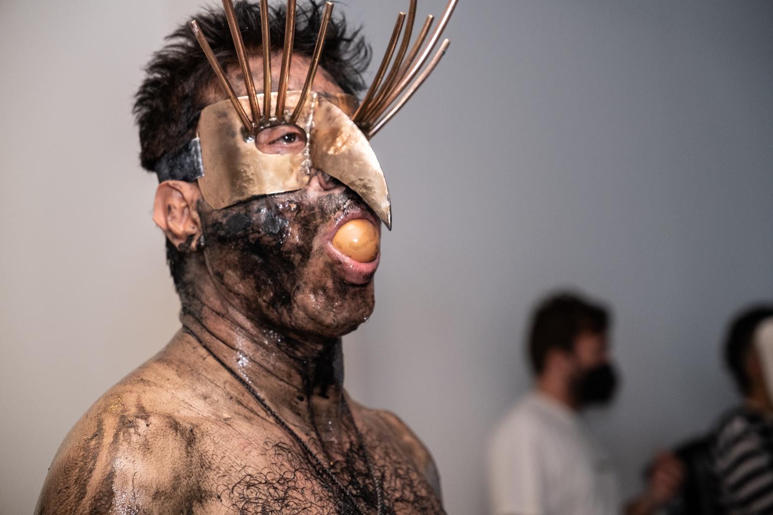 Curators Dominique Malaquais and Julie Peghini gave Amin carte blanche for his collaborative performance This Is Not Your El Dorado which took place at the Cité Internationale des arts in Paris on September 11, 2021 from 6:37 pm to 7:54 pm as part of their larger project, Performative Utopias, an academic conference on contemporary African performance. An obsessive reader of fiction, Amin saw this as an opportunity to write his own story through performance. He conceived of each of the five levels of the Cité’s gallery as a chapter within a novel running through the mind of the reader/observer. For this happening, 18 performances, both live and pre-recorded in sound or video, took place at the same time. Its prologue was a sound piece presented outside the gallery’s doors in which Cameroonian writer Lionel Manga read aloud his short story in French about the American civil rights movement of the 1960s. Paris-based actor Olivier Llorden screeched as he interacted with a Minotaur-like helmet created by Amin. Once the doors to the show were officially opened, Congolese poet and rapper Vhan Olsen Dombo seemed to pull himself with a rope into the white cube, crawling through the churning legs of the crowd. Inside as out, Amin’s sculptural pieces connected the varied performances as if by a thread. Multidisciplinary artists from across the globe adopted his helmets, masks, blindfolds, bustiers, fingernails, Arabic letters and ceremonial Hindu pigment to tell a story that was not only his, but part of their own. Dominique and Julie wrote in their curatorial note: “The dreams and myths of some are the source of marginalization and exile for others. This Is Not Your El Dorado confronts this terrible paradox.”