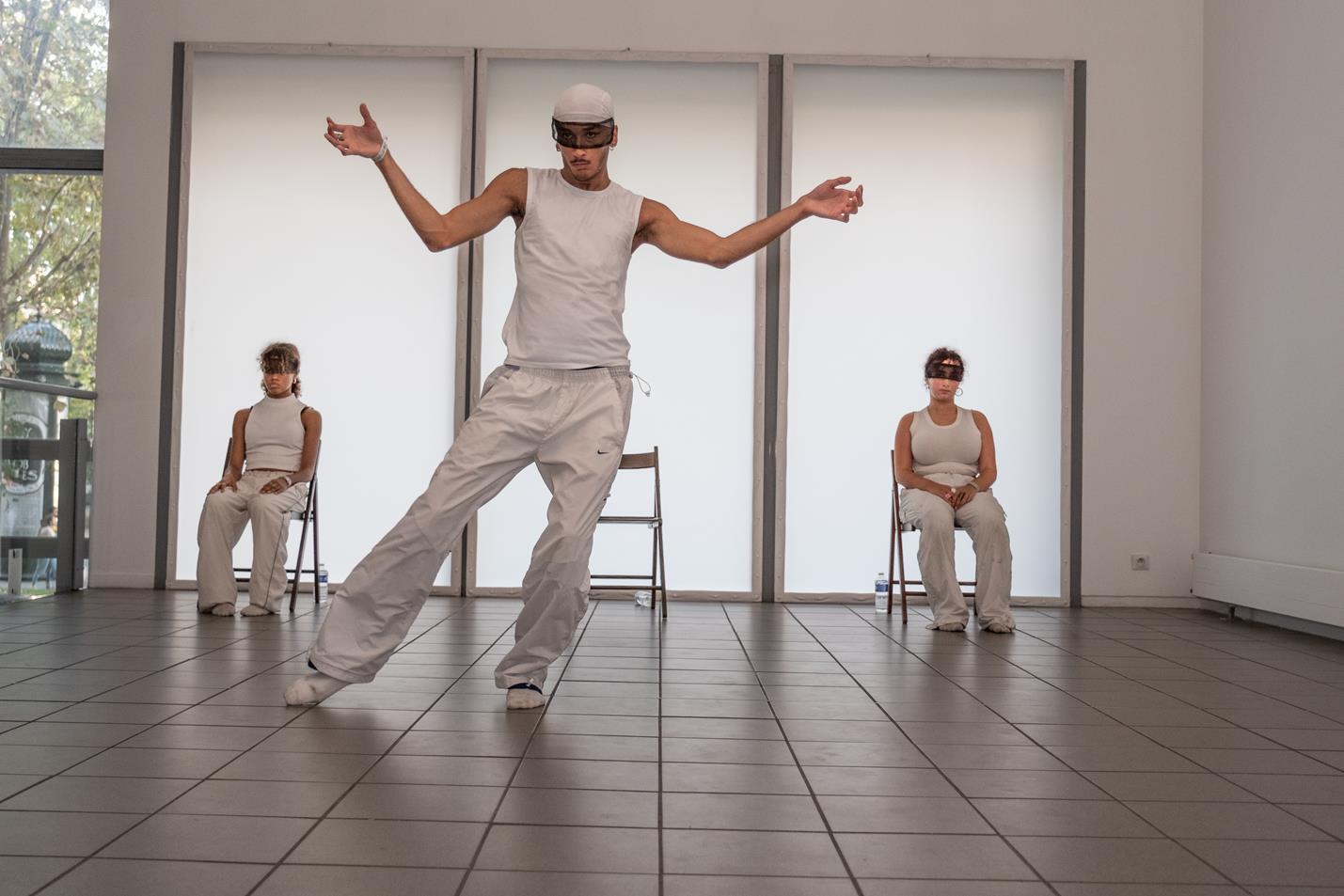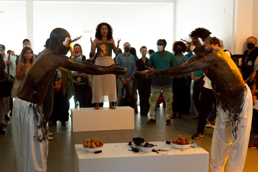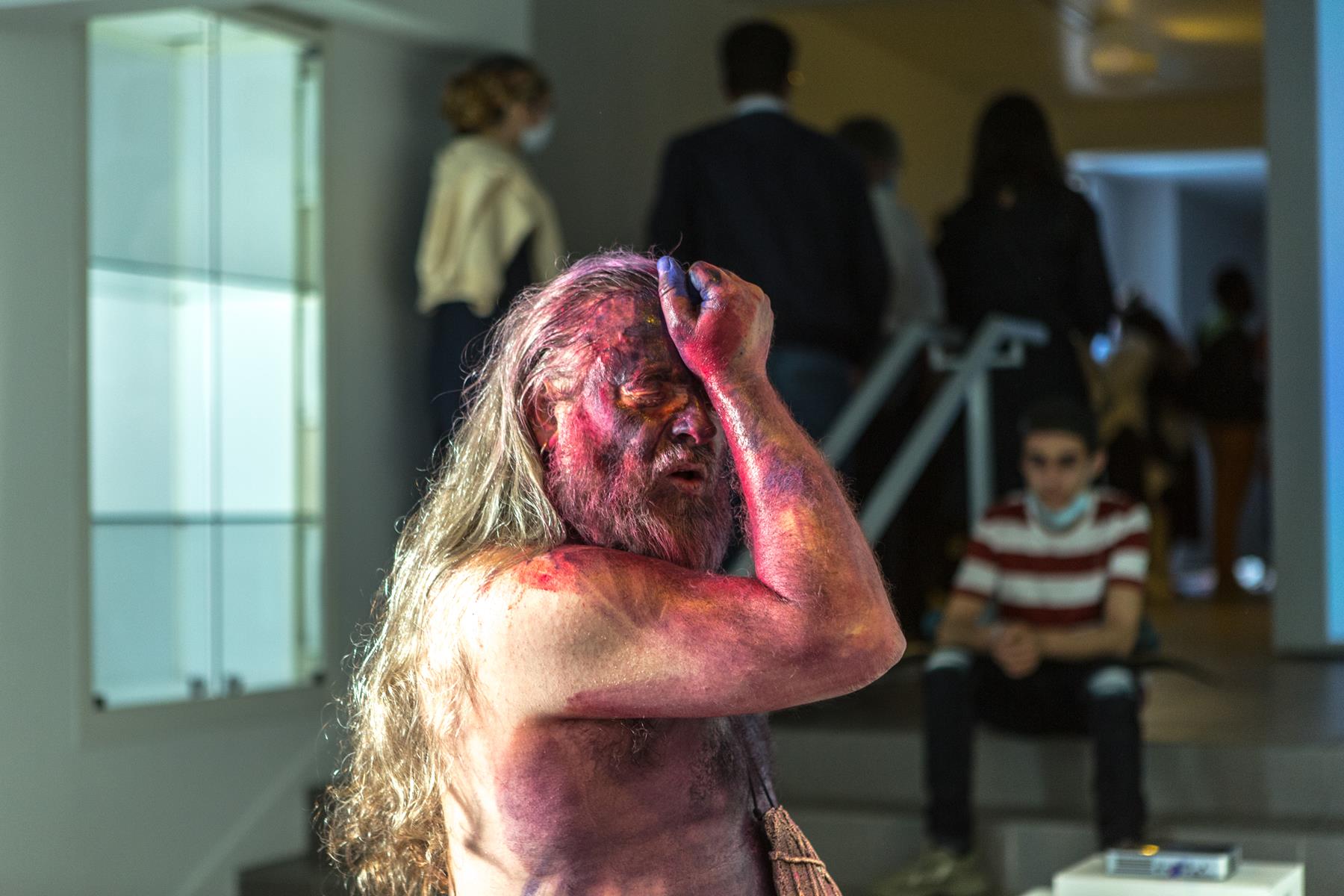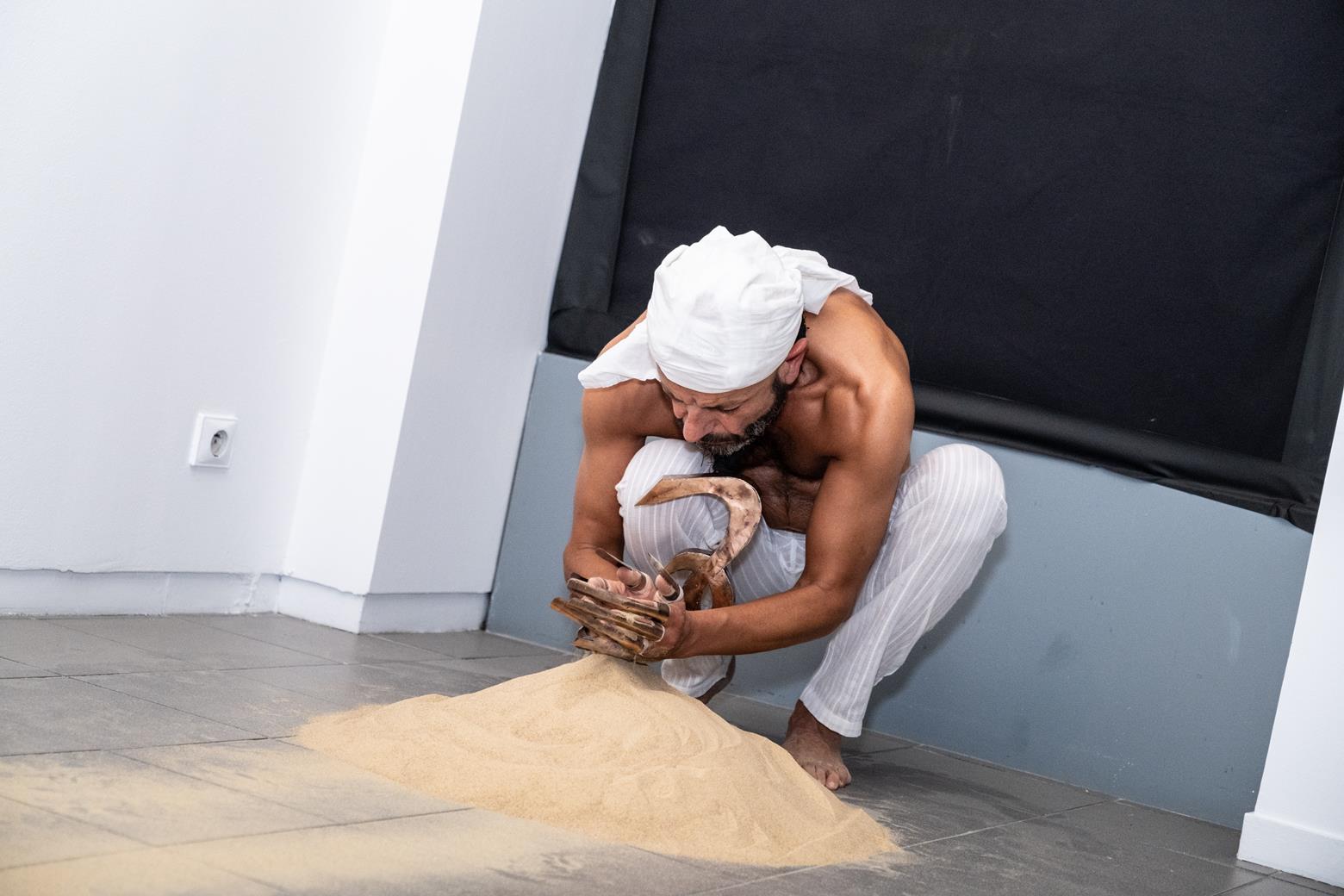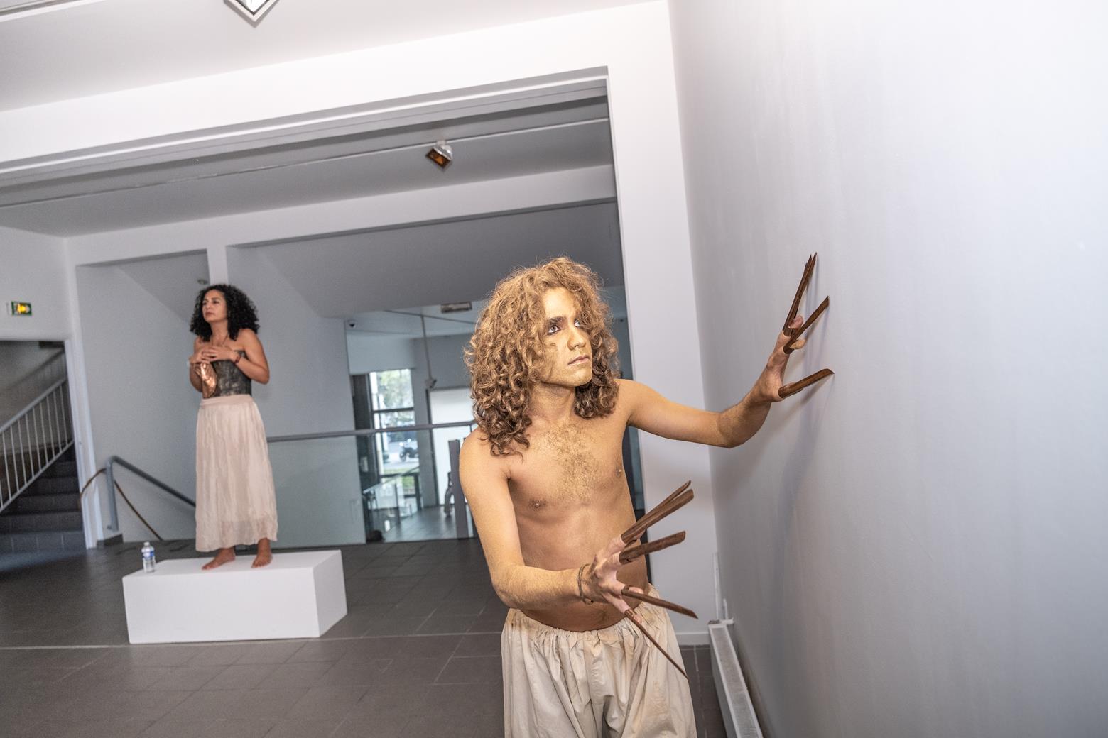 Curators Dominique Malaquais and Julie Peghini gave Amin carte blanche for his collaborative performance This Is Not Your El Dorado which took place at the Cité Internationale des arts in Paris on September 11, 2021 from 6:37 pm to 7:54 pm as part of their larger project, Performative Utopias, an academic conference on contemporary African performance. An obsessive reader of fiction, Amin saw this as an opportunity to write his own story through performance. He conceived of each of the five levels of the Cité’s gallery as a chapter within a novel running through the mind of the reader/observer. For this happening, 18 performances, both live and pre-recorded in sound or video, took place at the same time. Its prologue was a sound piece presented outside the gallery’s doors in which Cameroonian writer Lionel Manga read aloud his short story in French about the American civil rights movement of the 1960s. Paris-based actor Olivier Llorden screeched as he interacted with a Minotaur-like helmet created by Amin. Once the doors to the show were officially opened, Congolese poet and rapper Vhan Olsen Dombo seemed to pull himself with a rope into the white cube, crawling through the churning legs of the crowd. Inside as out, Amin’s sculptural pieces connected the varied performances as if by a thread. Multidisciplinary artists from across the globe adopted his helmets, masks, blindfolds, bustiers, fingernails, Arabic letters and ceremonial Hindu pigment to tell a story that was not only his, but part of their own. Dominique and Julie wrote in their curatorial note: “The dreams and myths of some are the source of marginalization and exile for others. This Is Not Your El Dorado confronts this terrible paradox.”