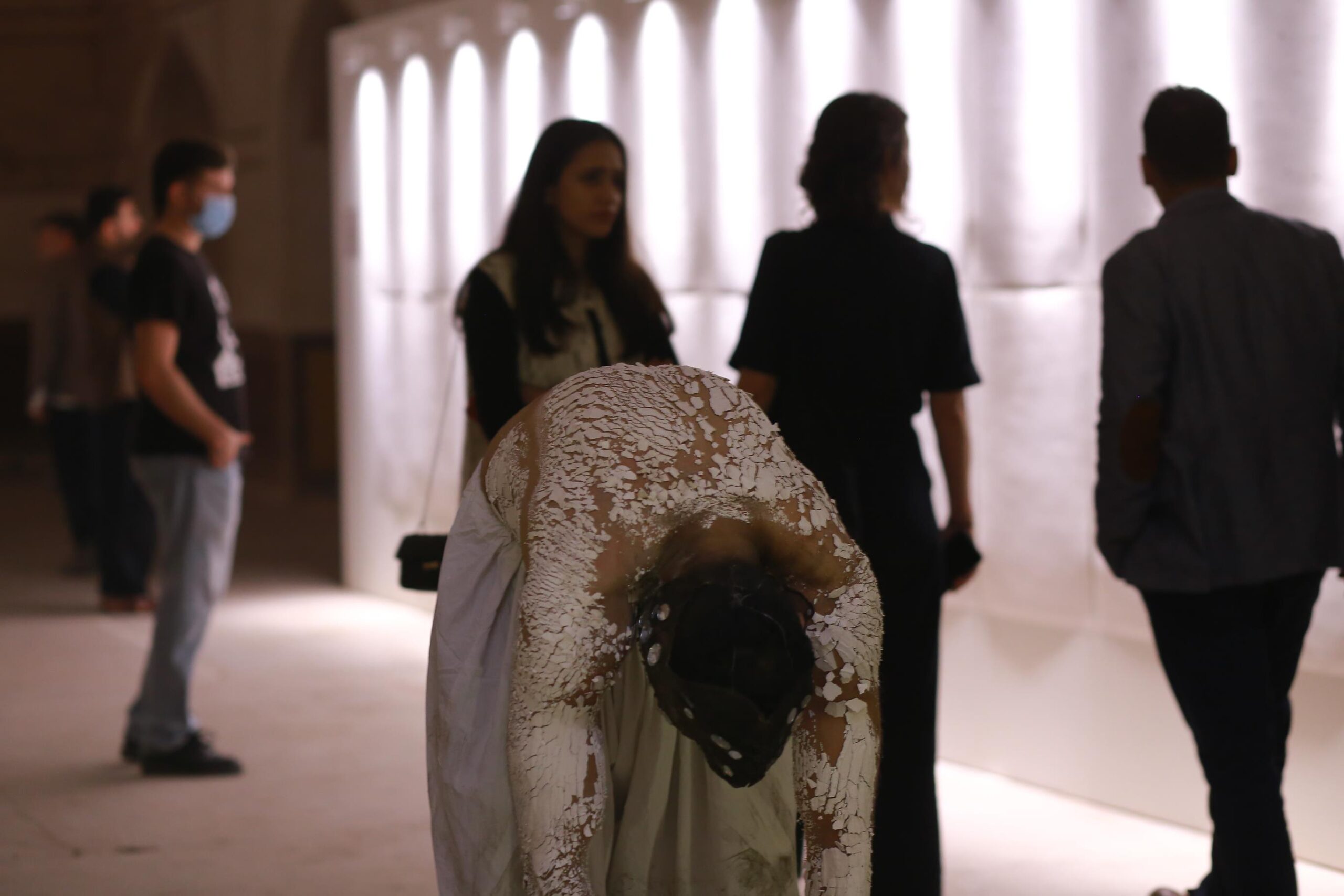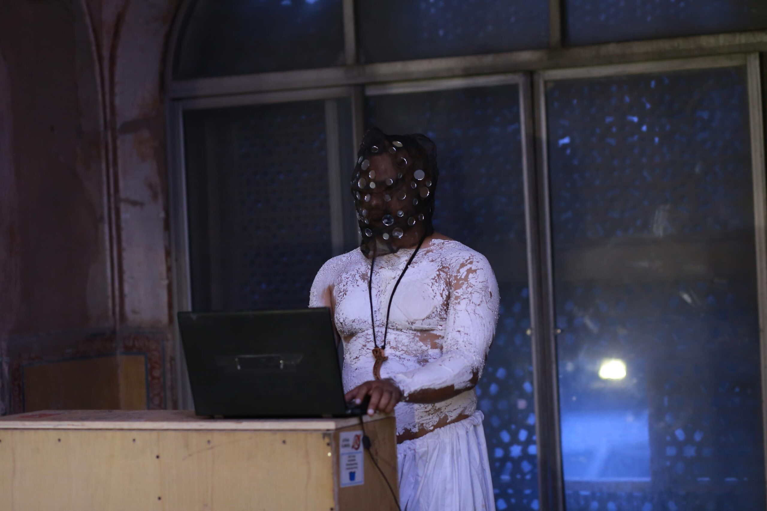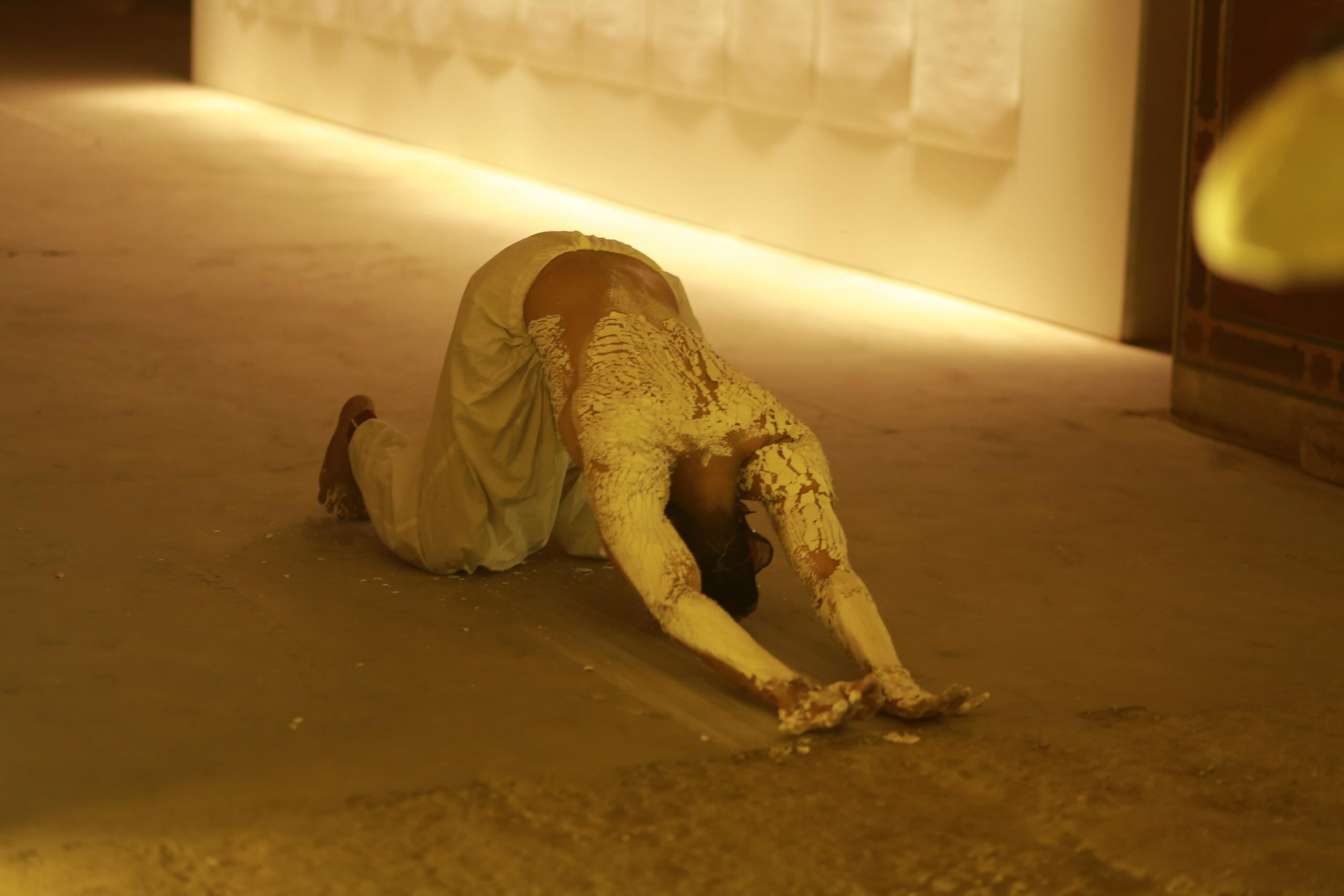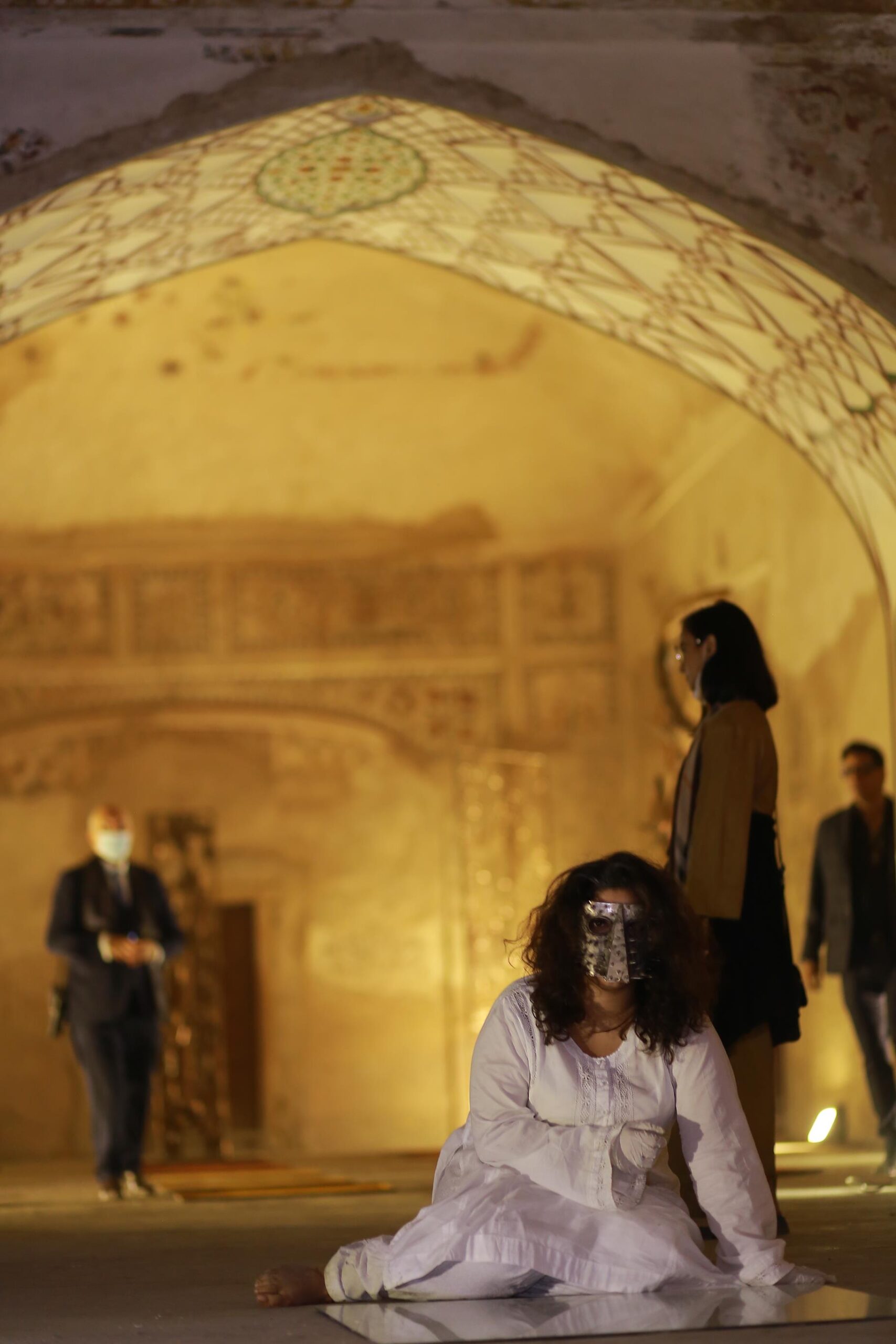 Amin created the performance Triangle to activate his installation, Spice, for a group exhibition at the Lahore Fort in March 2022. Curator Sabah Husain titled the show If There Is Paradise on Earth, referencing a couplet by the Indo-Persian musician, poet and scholar Amir Khusrau (1253–1325 AD). Three Lahore-based artists—Umme Farwa Hassan Rizvi, Talal Faisal and Idrees Hanif—performed the work for Amin the night of the opening within his installation of five vertical works in copper positioned within 18 three-foot-by-three-foot squares of either turmeric or red chili. Wearing a white kurta over a white shalwar and a cubist mask of silver with nails protruding from it, Farwa sat on the floor, staring into a square of mirror. Idrees, wearing a white shalwar, his chest crusted with plaster of Paris and a mesh hood dotted with round mirrors, stood before a laptop, randomly rearranging prerecorded urban sounds that played throughout the 150-minute performance. Also caked in plaster, Talal made a series of seven predetermined movements. The three concluded the three-hour performance by carefully navigating the narrow pathways separating the squares of spice, repeatedly crossing one another’s trajectories, but never interrupting them. Significantly for Amin, who wrote his undergraduate thesis on Mogul architecture, the group show was installed in the Lahore Fort’s Summer Palace, a labyrinth of chambers that dates from the Shah Jahan period (1628-1658 AD). Its walls decorated with intricate frescoes and marble inlay, now faded, the palace spoke to Amin of ghosts. The smell of the nearly 200 pounds of spice in the low-ceilinged palace was powerful. Through this intentional insertion of the olfactory, Amin wished to summon the themes of empire, colonialism and magic conjured in Frank Herbert’s 1965 science fiction novel Dune, in which the pursuit of “spice,” a drug that extends life, enhances the mind and is essential for inter-planetary travel, propels the narrative.