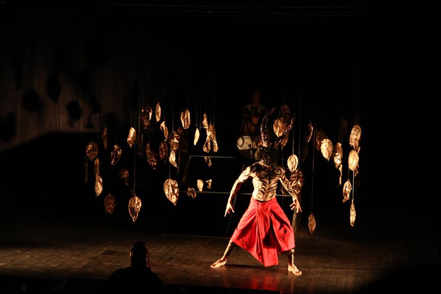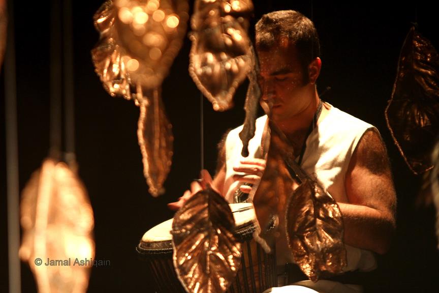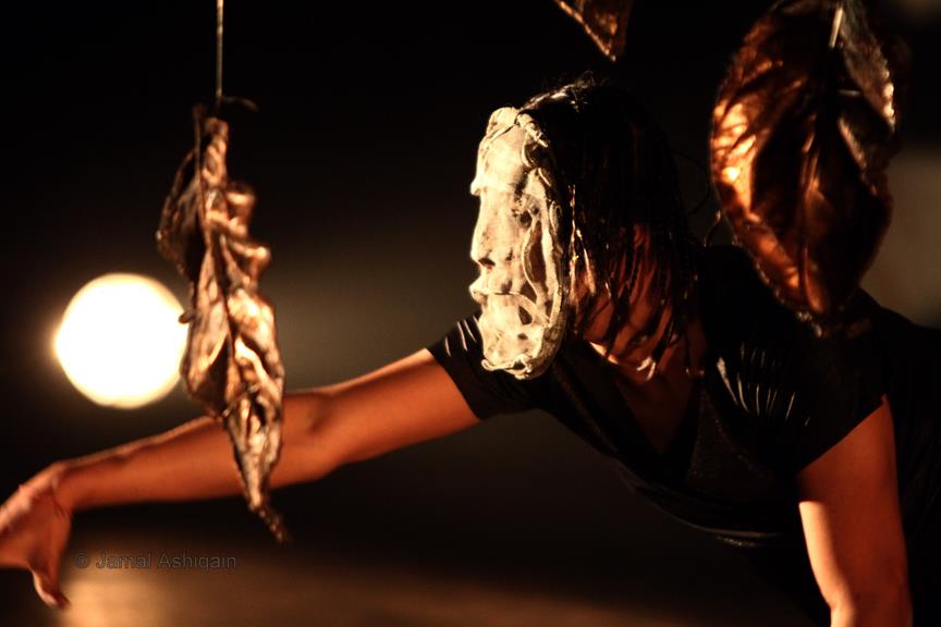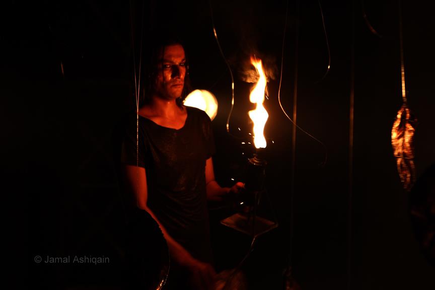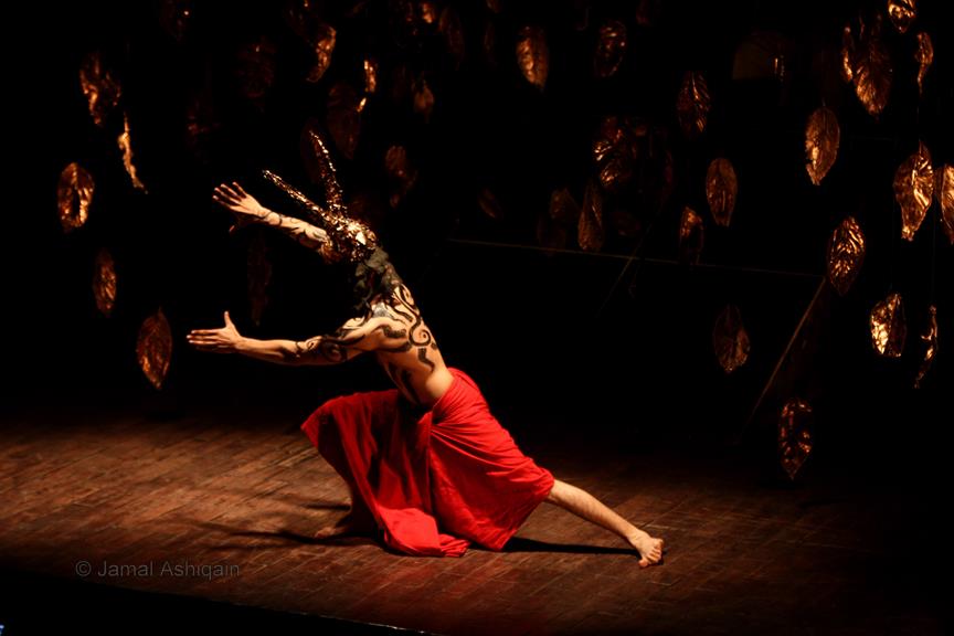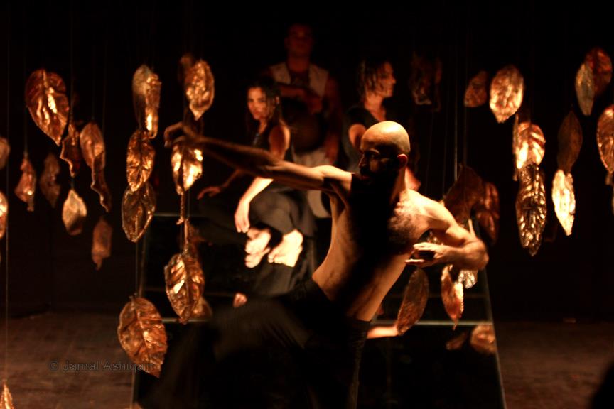 Where’s the Apple, Joshinder? was a 43-minute movement-based performance conceived and choreographed by Amin that was presented for three consecutive nights at the auditorium of the Karachi Arts Council. It featured the dancer Joshinder Chaggar; the actors Sunil Shankar, Kashif Hussain, Erum Bashir and Vajdaan Shah; the musicians Haamid Rahim and Sikandar Mufti; and the painter and performance artist Syed Ammad Tahir. Amin worked with this multidisciplinary group for six months to create the work, which revolved around a large installation in the form of an Indo-Persian garden that he had recreated out of copper leaves hanging from steel beams above an eight-foot by four-foot wedge of mirror. It began with Haamid wearing a black robe and copper helmet sitting within the audience with his back turned to it as he played his own electronic composition. Kashif, in an orange sarong and copper helmet with curving horns, emerged from the orchestra pit. His bare torso and legs painted in strokes of black paint, he moved back and forth across the stage, tossing his head like a bull. Wearing a mesh mask, Sunil then entered the stage on all fours, prowling catlike. He climbed onto the central, mirrored surface, constructed in a slant, seeming to recoil from his own image. Wearing an avian mask of looking glass and nickel-plated copper, Joshinder lifted her cocked head from behind the reflective slide. Sunil and Joshinder sparred and embraced. Erum and Vajdaan joined them on stage, pairing off with the two in various combinations of male with female, female with female, male with male. Ammad then appeared onstage dressed in formal South Asian bridalwear while Sikandar coaxed a tabla, a drum associated with courtesan dances of the 18th century. The action that occurred around and atop the installation explored gender and the non-binary. In the end, Sunil, Joshinder, Vajdaan and Erum burned the nylon from which the leaves hung, destroying the paradisical garden.