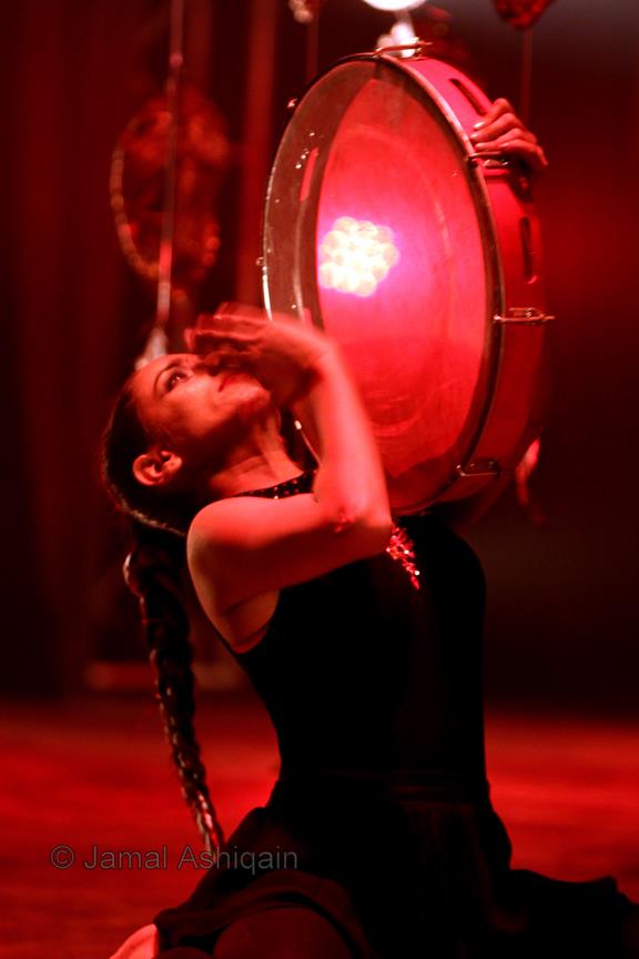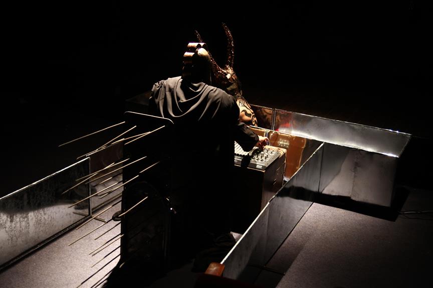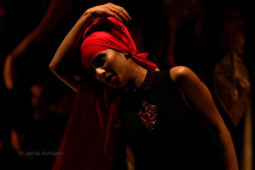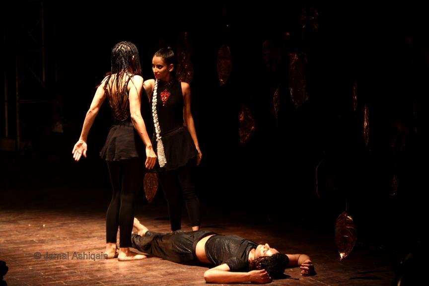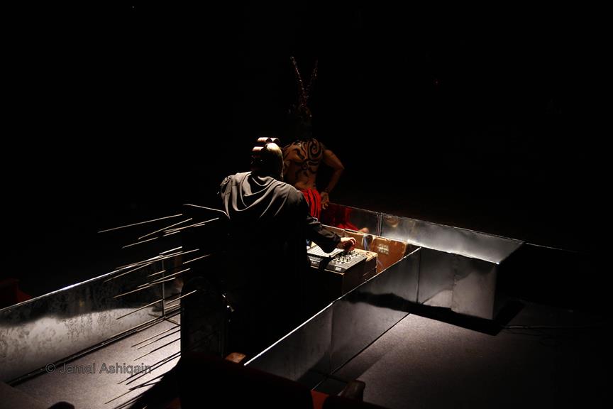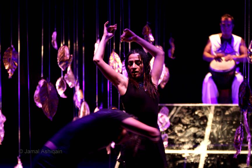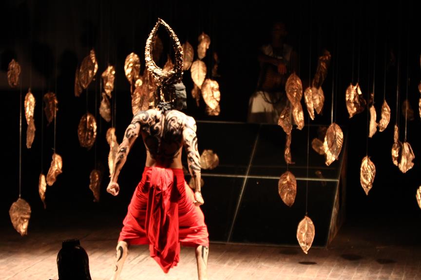 Where’s the Apple, Joshinder? was a 43-minute movement-based performance conceived and choreographed by Amin that was presented for three consecutive nights at the auditorium of the Karachi Arts Council. It featured the dancer Joshinder Chaggar; the actors Sunil Shankar, Kashif Hussain, Erum Bashir and Vajdaan Shah; the musicians Haamid Rahim and Sikandar Mufti; and the painter and performance artist Syed Ammad Tahir. Amin worked with this multidisciplinary group for six months to create the work, which revolved around a large installation in the form of an Indo-Persian garden that he had recreated out of copper leaves hanging from steel beams above an eight-foot by four-foot wedge of mirror. It began with Haamid wearing a black robe and copper helmet sitting within the audience with his back turned to it as he played his own electronic composition. Kashif, in an orange sarong and copper helmet with curving horns, emerged from the orchestra pit. His bare torso and legs painted in strokes of black paint, he moved back and forth across the stage, tossing his head like a bull. Wearing a mesh mask, Sunil then entered the stage on all fours, prowling catlike. He climbed onto the central, mirrored surface, constructed in a slant, seeming to recoil from his own image. Wearing an avian mask of looking glass and nickel-plated copper, Joshinder lifted her cocked head from behind the reflective slide. Sunil and Joshinder sparred and embraced. Erum and Vajdaan joined them on stage, pairing off with the two in various combinations of male with female, female with female, male with male. Ammad then appeared onstage dressed in formal South Asian bridalwear while Sikandar coaxed a tabla, a drum associated with courtesan dances of the 18th century. The action that occurred around and atop the installation explored gender and the non-binary. In the end, Sunil, Joshinder, Vajdaan and Erum burned the nylon from which the leaves hung, destroying the paradisical garden.